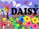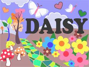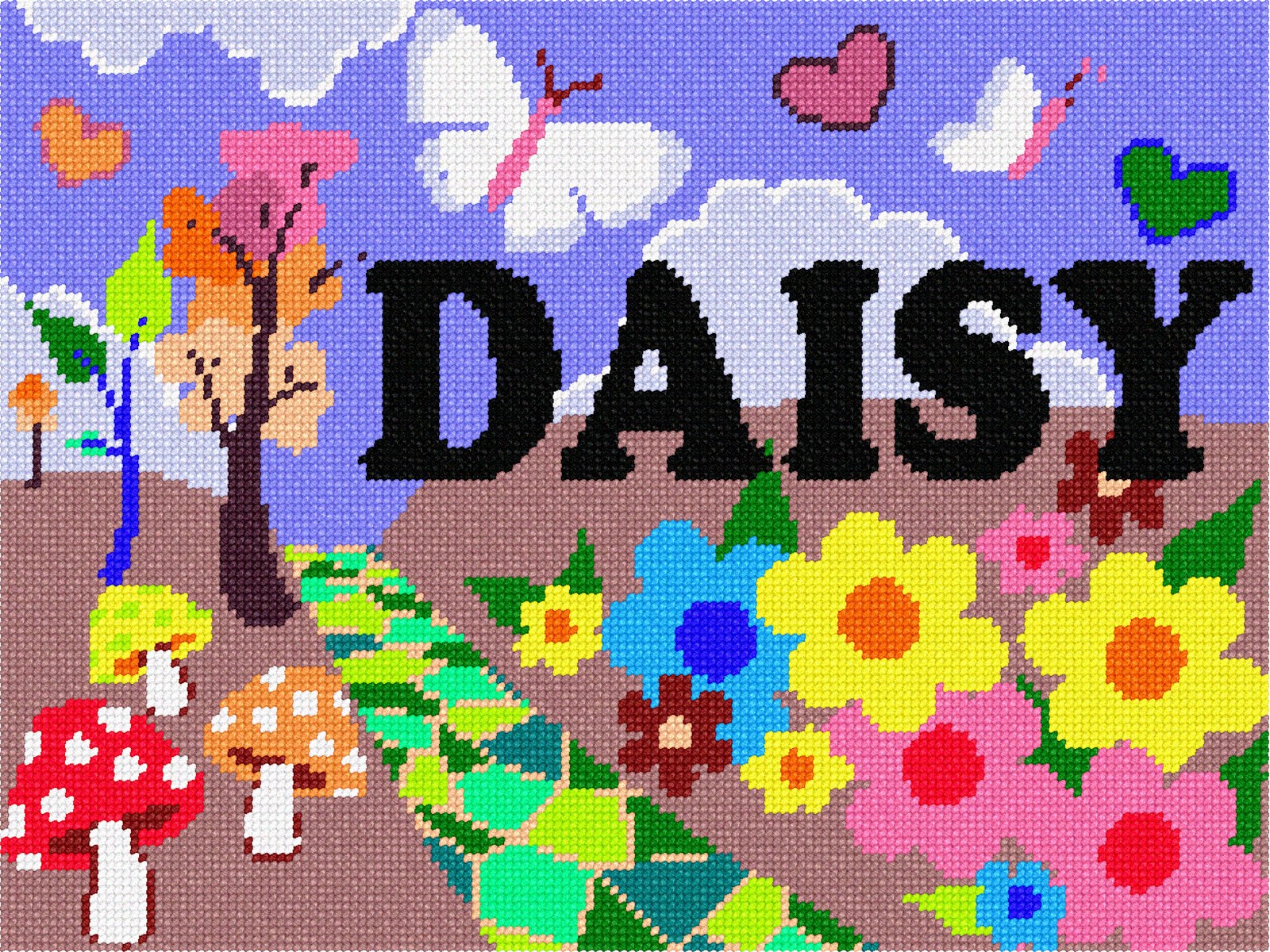 A name set against a mythical floral scene featuring flying hearts, butterflies, colorful mushrooms, funky foliage, and a tiled little road into the horizon.