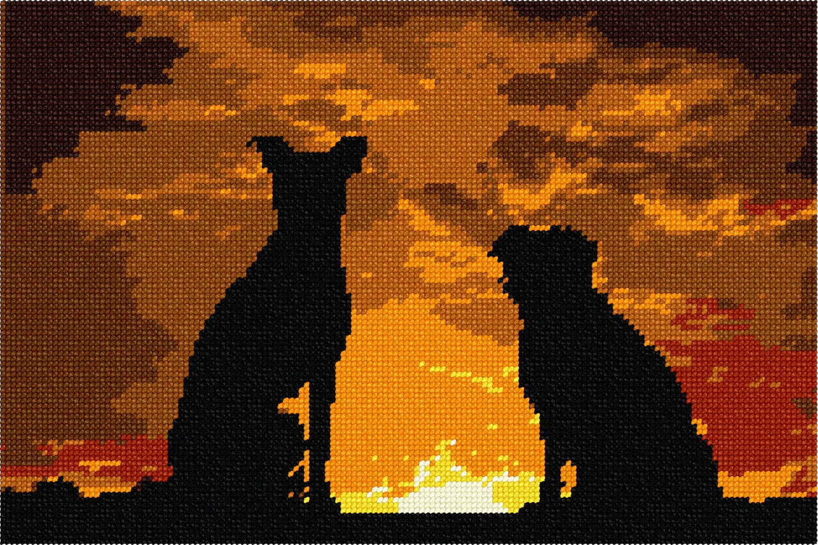 Two dogs watching the sunset. A silhouette (English: /ˌsɪluˈɛt/ SIL-oo-ET, French: [silwɛt]) is the image of a person, animal, object or scene represented as a solid shape of a single color, usually black, with its edges matching the outline of the subject.