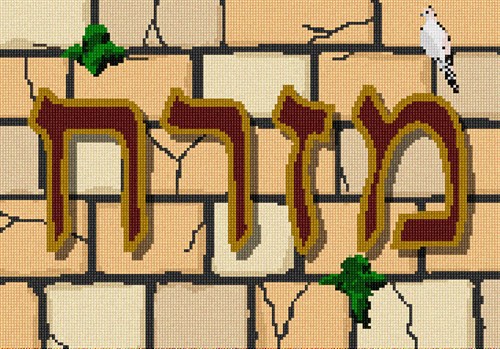 The hebrew for east - Mizrach - displayed against a background of ancient Jerusalem stone. Traditional Jewish prayer in the western hemisphere requires participants to face East, the direction where the Jewish Temple of old used to stand. The last remaining remnant of that holy site is known today as the Western Wall.