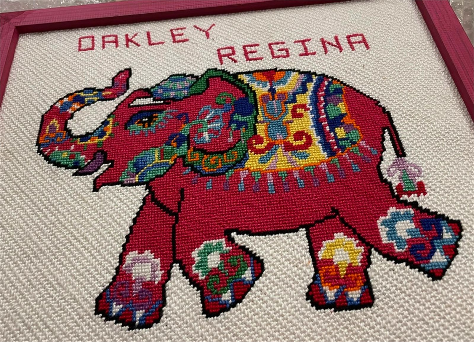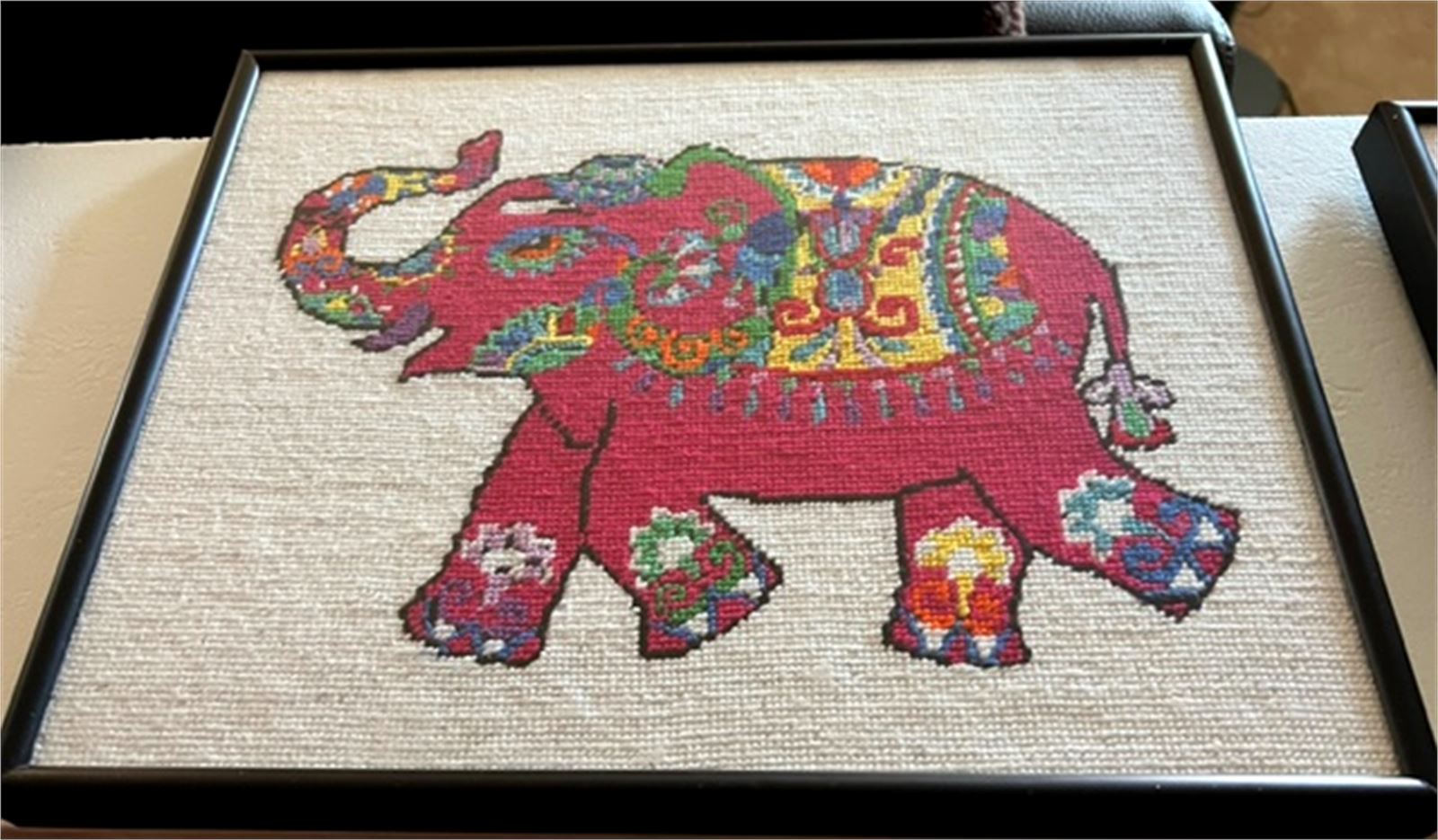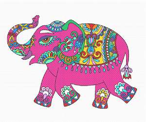 A colorful elephant that's fun to stitch. Elephants are popular in needlepoint. They are beloved by people both young and old. These magnificent mammals spend between 12 to 18 hours eating grass, plants and fruit every single day. They use their long trunks to smell their food and lift it up into their mouths. Elephants have created their very own sunscreen. After a river or swamp bath, they’ll throw mud and sand up and over themselves to protect their skin from the hot burning sun.