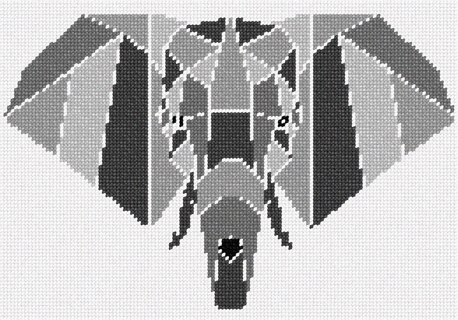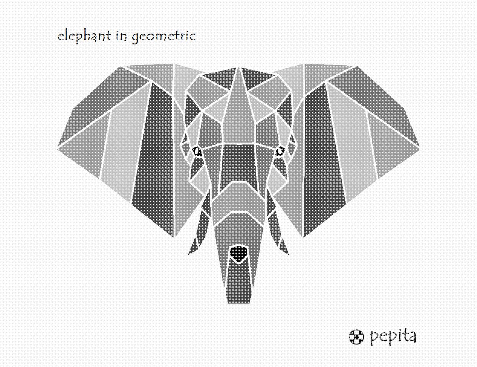 Origami like elephant head in shades of greys. Elephants are popular in needlepoint. They are beloved by people both young and old. These magnificent mammals spend between 12 to 18 hours eating grass, plants and fruit every single day. They use their long trunks to smell their food and lift it up into their mouths. Elephants have created their very own sunscreen. After a river or swamp bath, they’ll throw mud and sand up and over themselves to protect their skin from the hot burning sun.