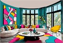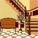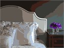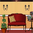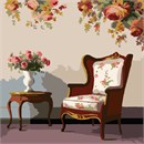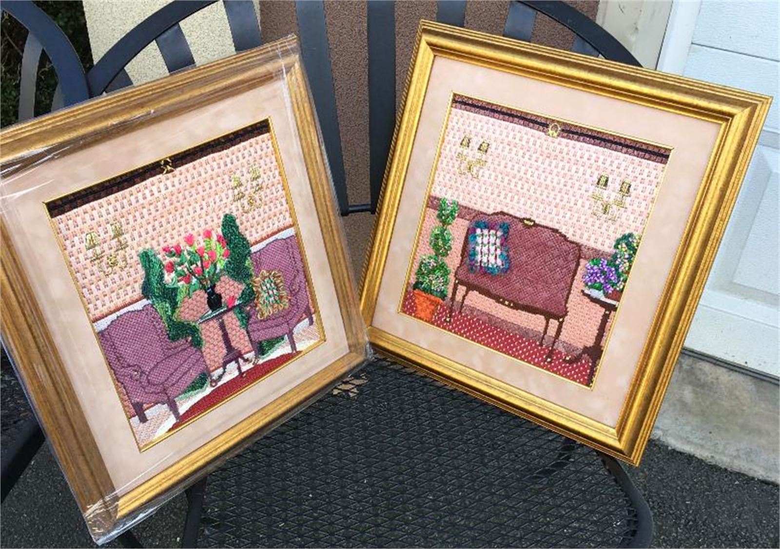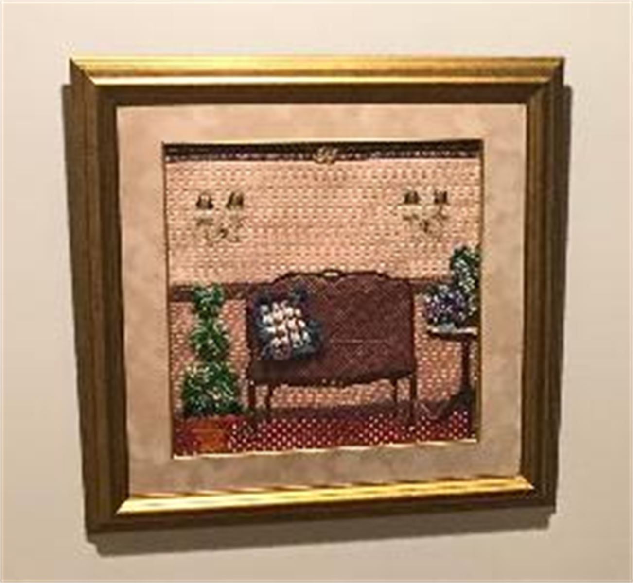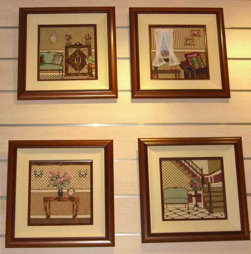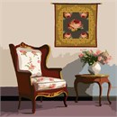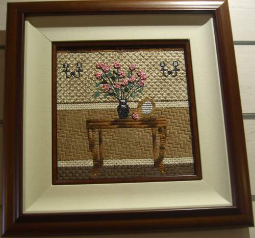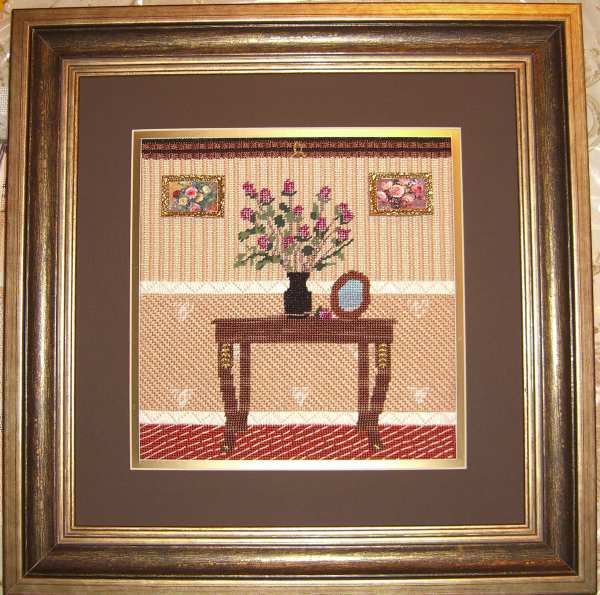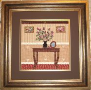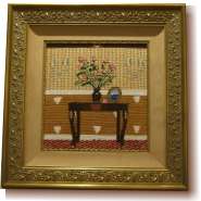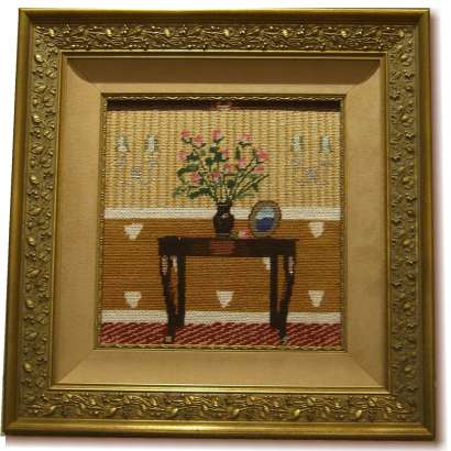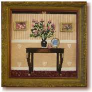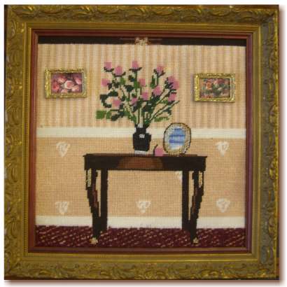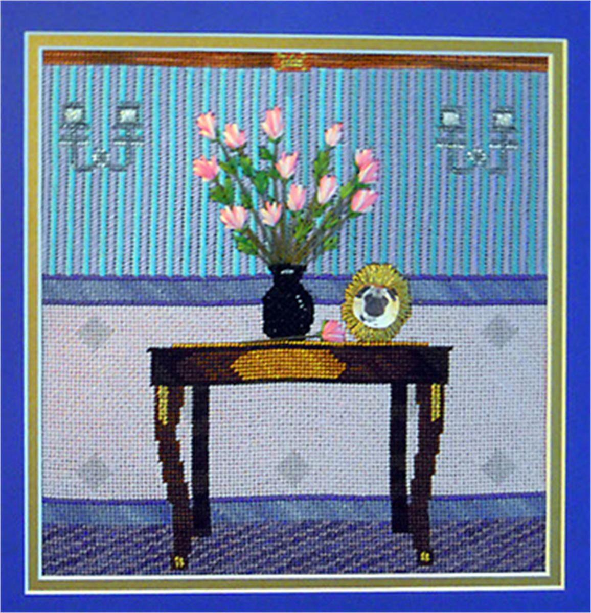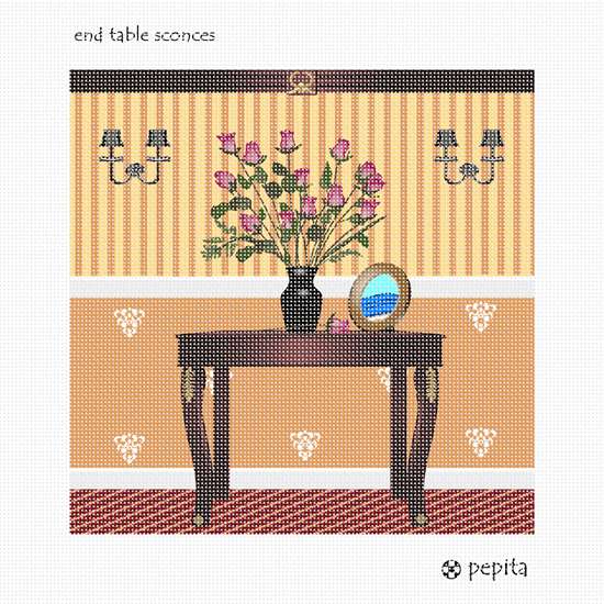Varnished mahogany end table with black vase of roses and two wall sconces. A contemporary home needlepoint piece to stitch anytime. Match the wallpaper to the walls of your home. This design coordinates with others in our Home Sweet Home series. A house is made of walls and beams, a home is built with love and dreams. ...