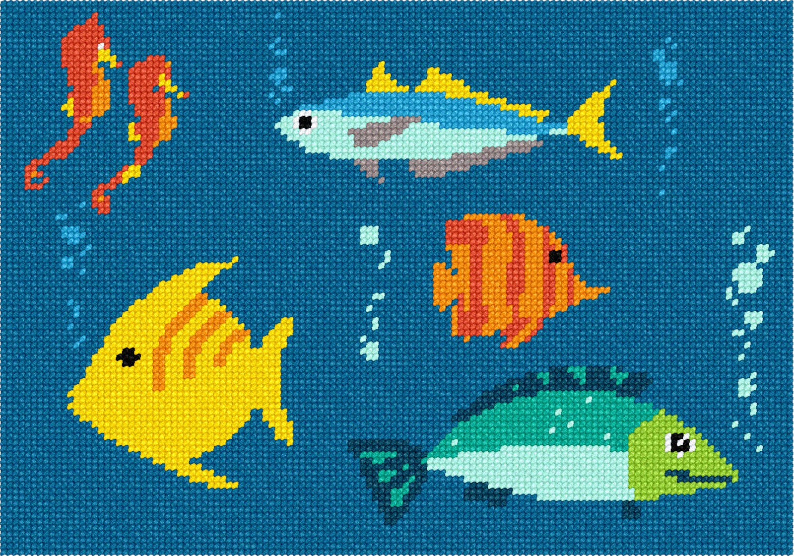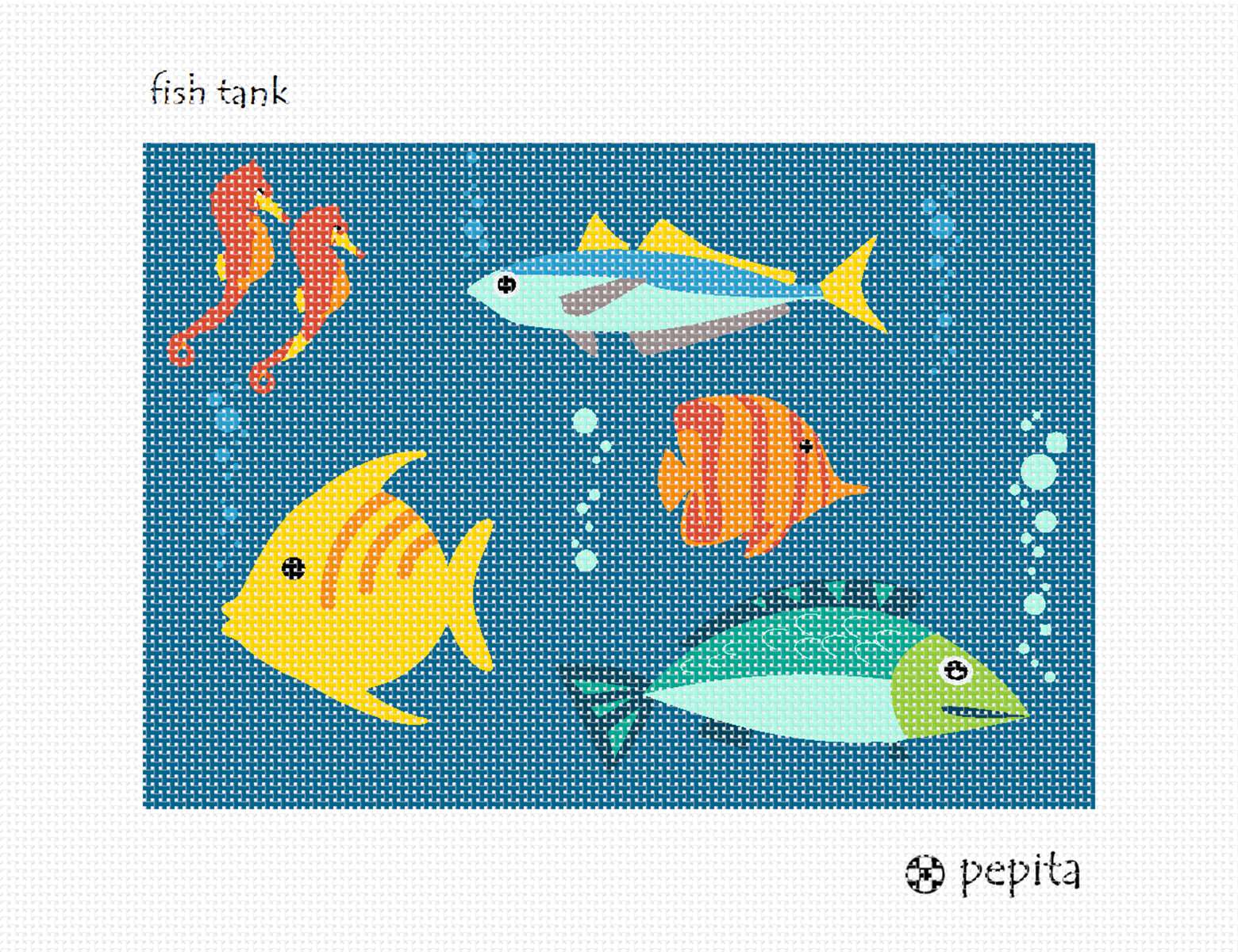Fish are playful pets. They like to chase each other for fun and hide behind aquatic plants. Sometimes, they serenely glide through the water or play with aquarium toys. Fish tanks lower anxiety and stress; the effect of watching the fish is serenity and calmness. Gazing at fish is therapeutic. Relax with a fish tank needlepoint.