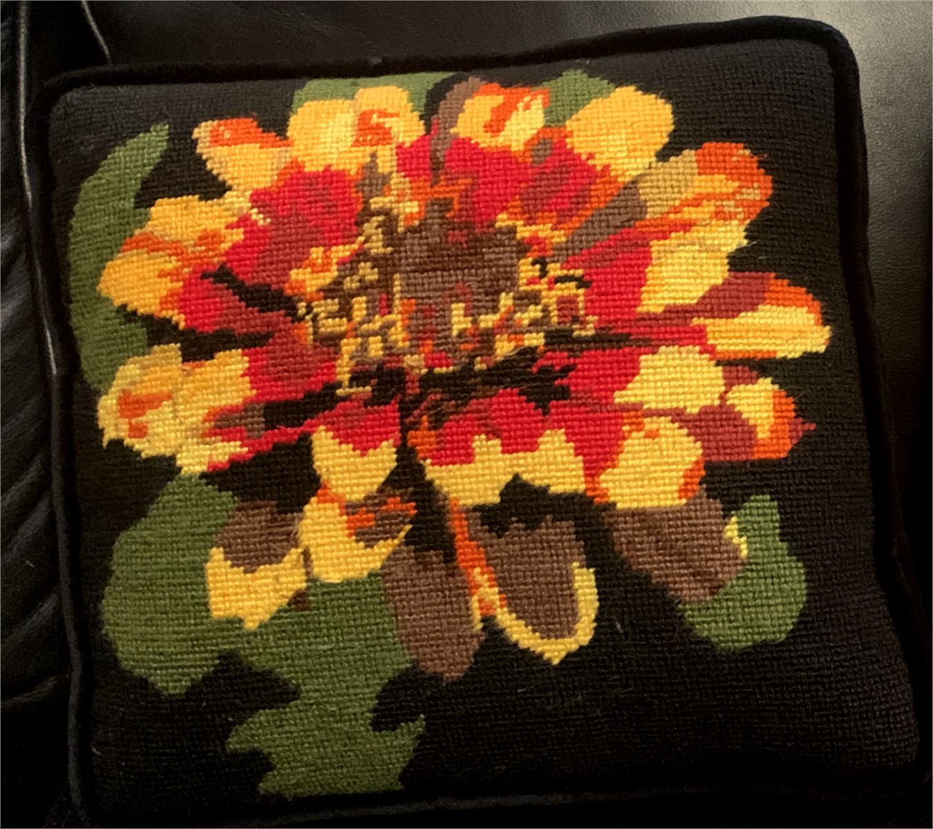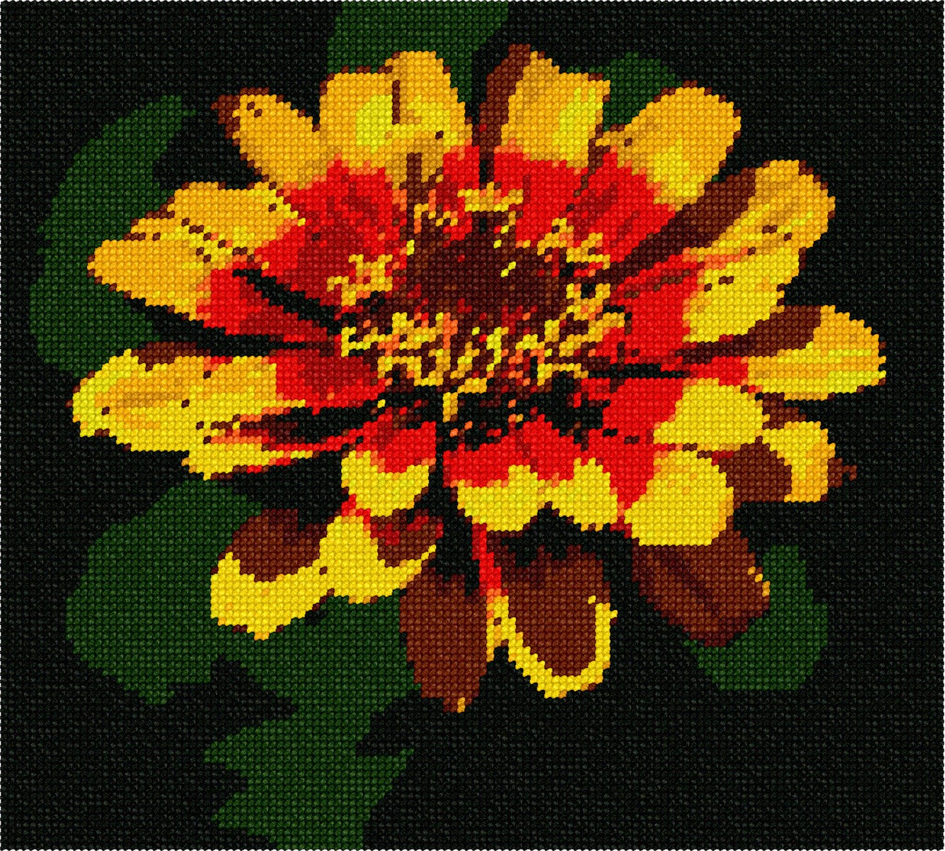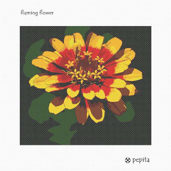 A flaming flower in bright reds and yellow. Flowers and floral design are among the most popular needlepoint designs. People have been stitching flowers and floral motifs for hundreds of years. Flowers are bright and pleasant, and most have underlying meanings to them.