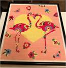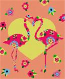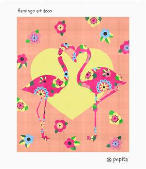 Two flamingos in an almost embrace behind a heart backdrop. Art deco flowers scatter the backgroungd. A wonderful needlepoint to stitch.
