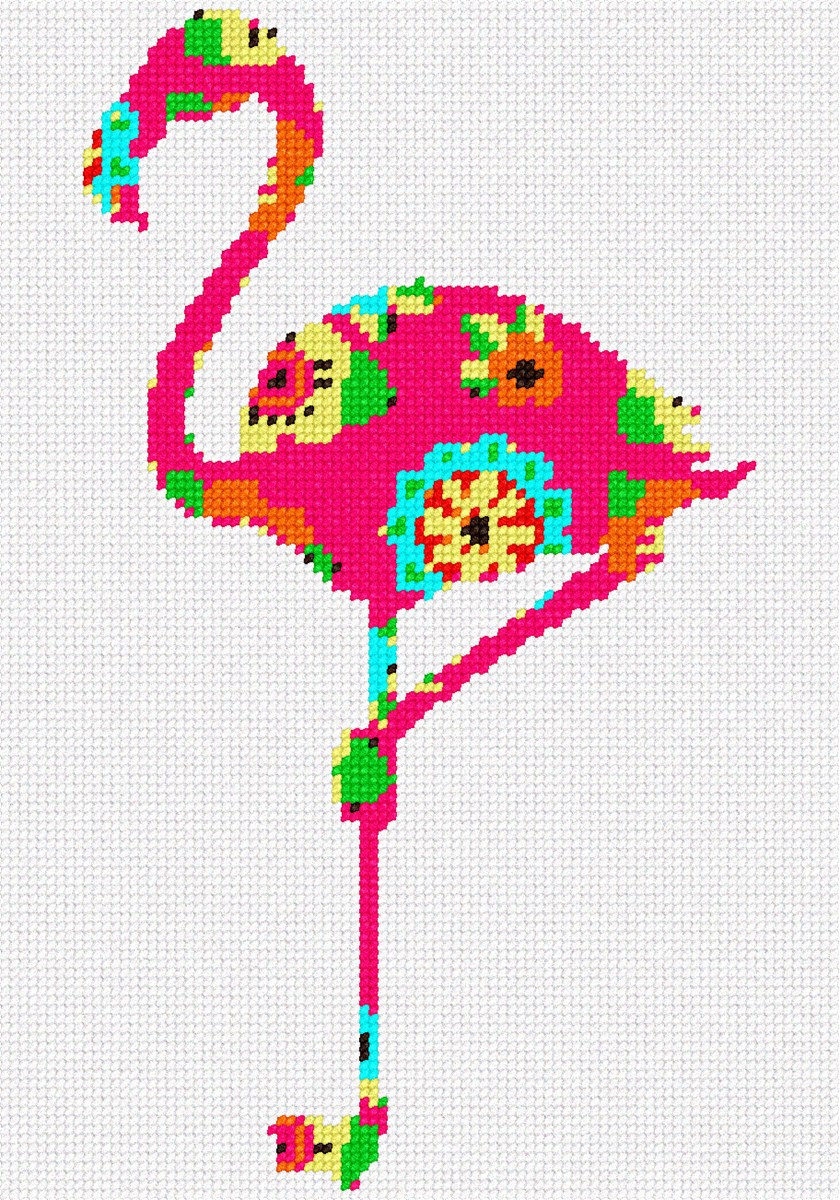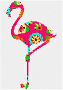 A flamingo with neon art deco flowers, perched on a leg facing left.