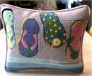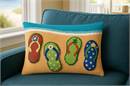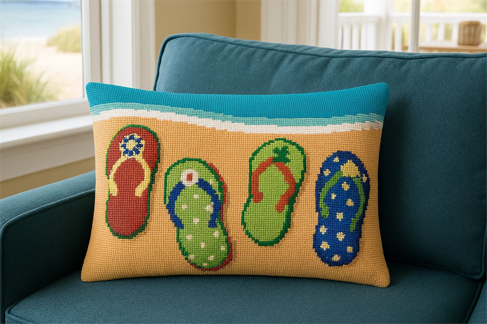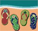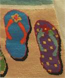 A fun assortment of colorful flip-flops, arranged side-by-side on the beach.