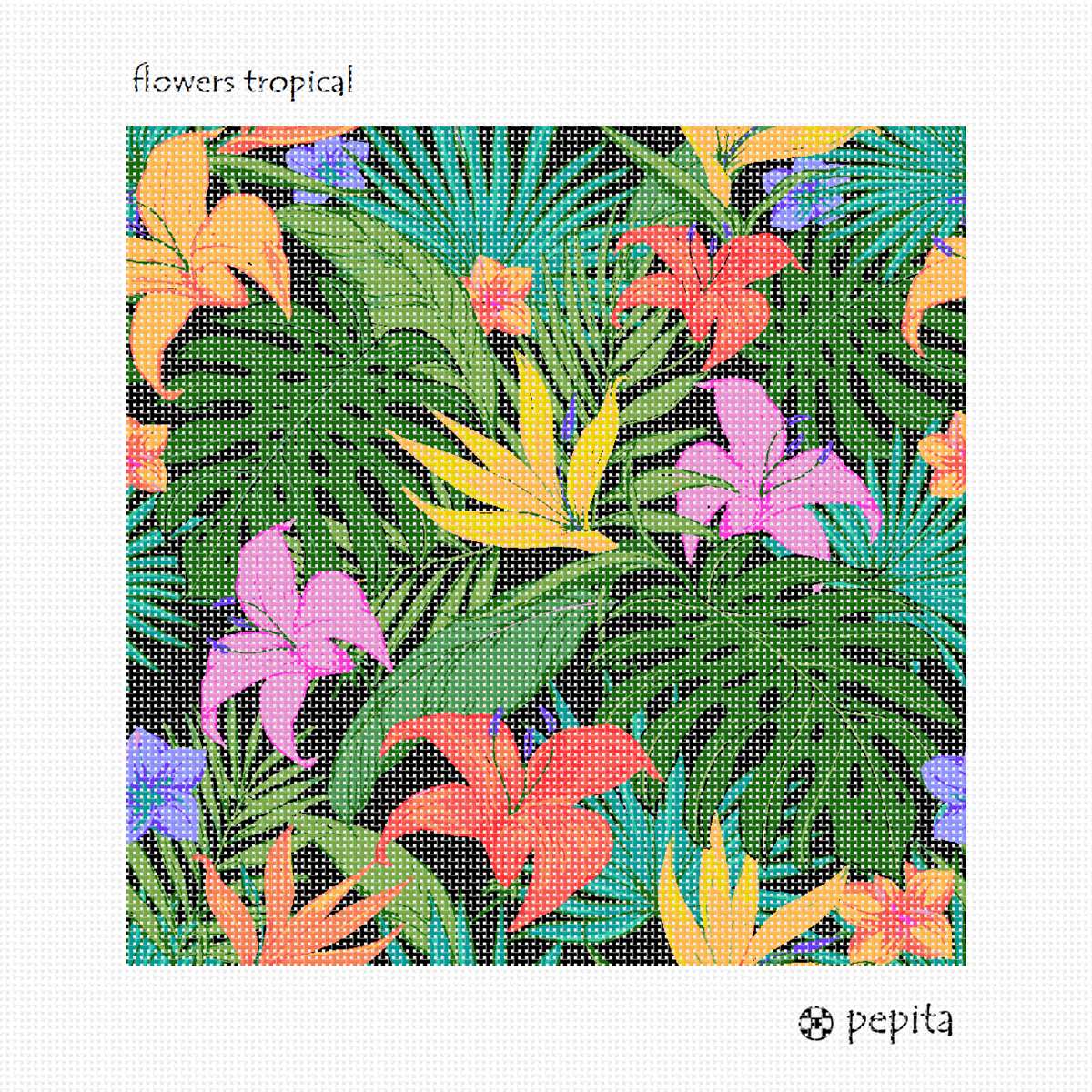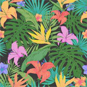 Tropical plants and flowers in vibrant colors. Flowers and floral design are among the most popular needlepoint designs. People have been stitching flowers and floral motifs for hundreds of years. Flowers are bright and pleasant, and most have underlying meanings to them.