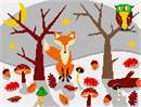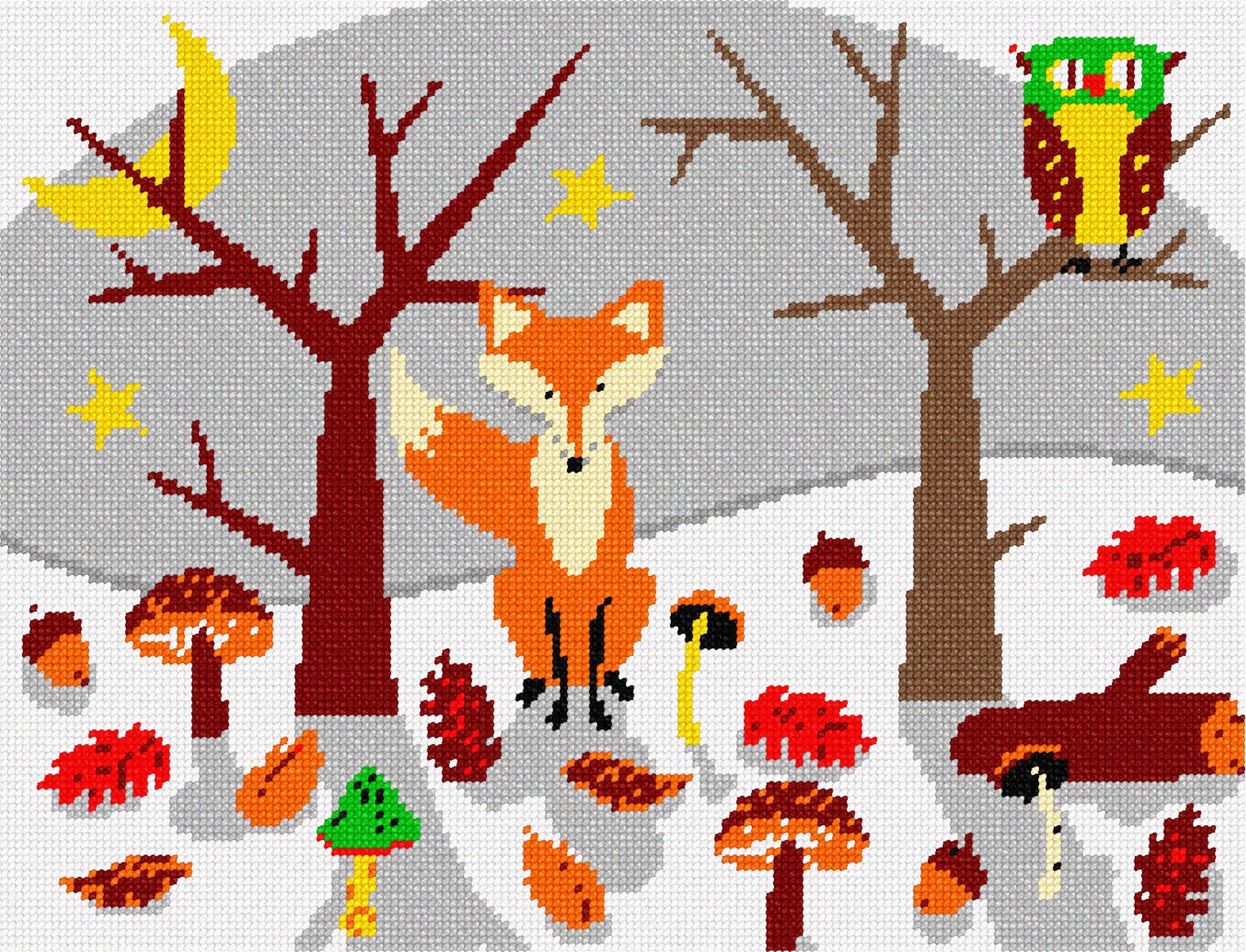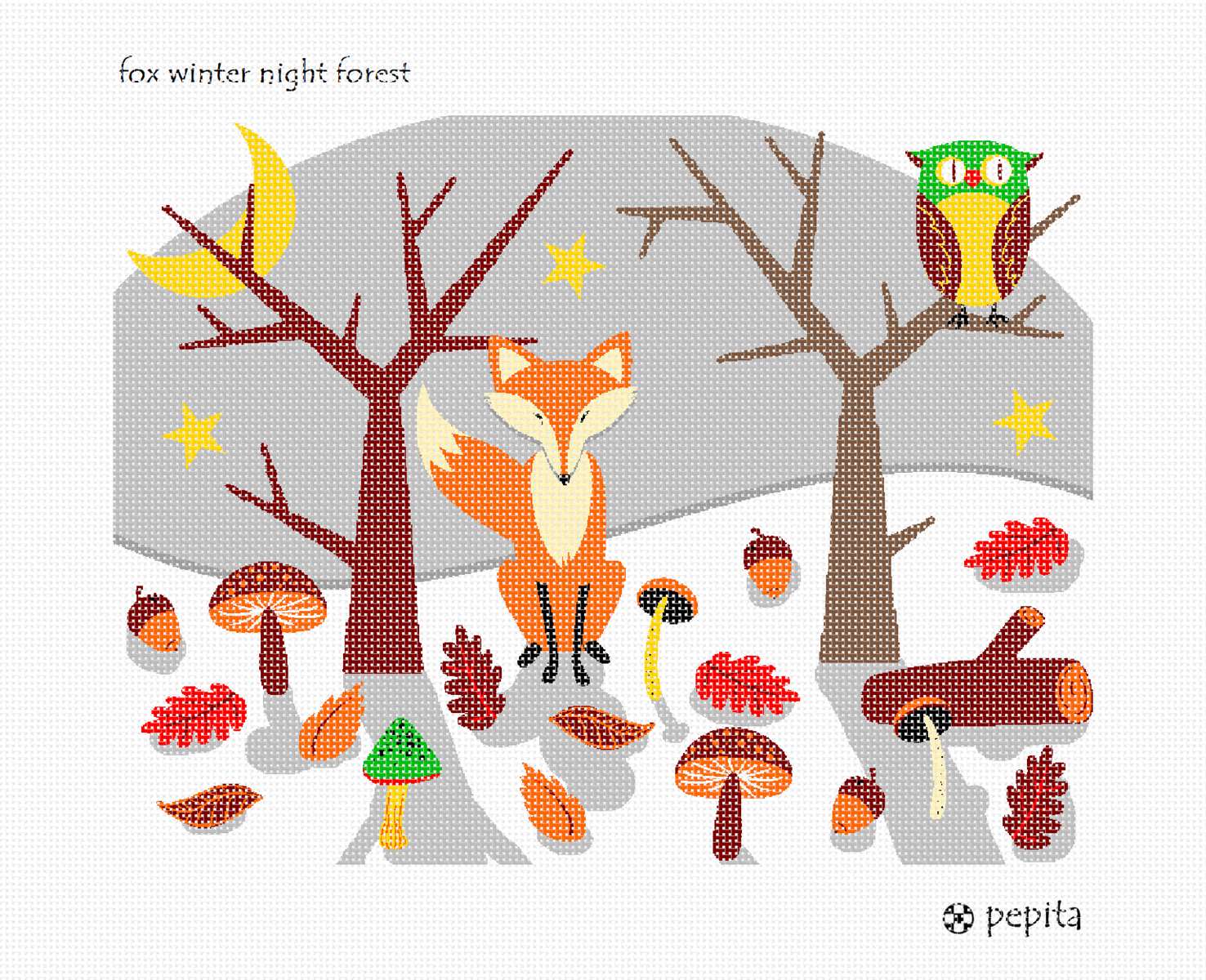 Grey winter night with a crescent moon as background. A fox, an owl and various flora litter the snow-covered forest floor.