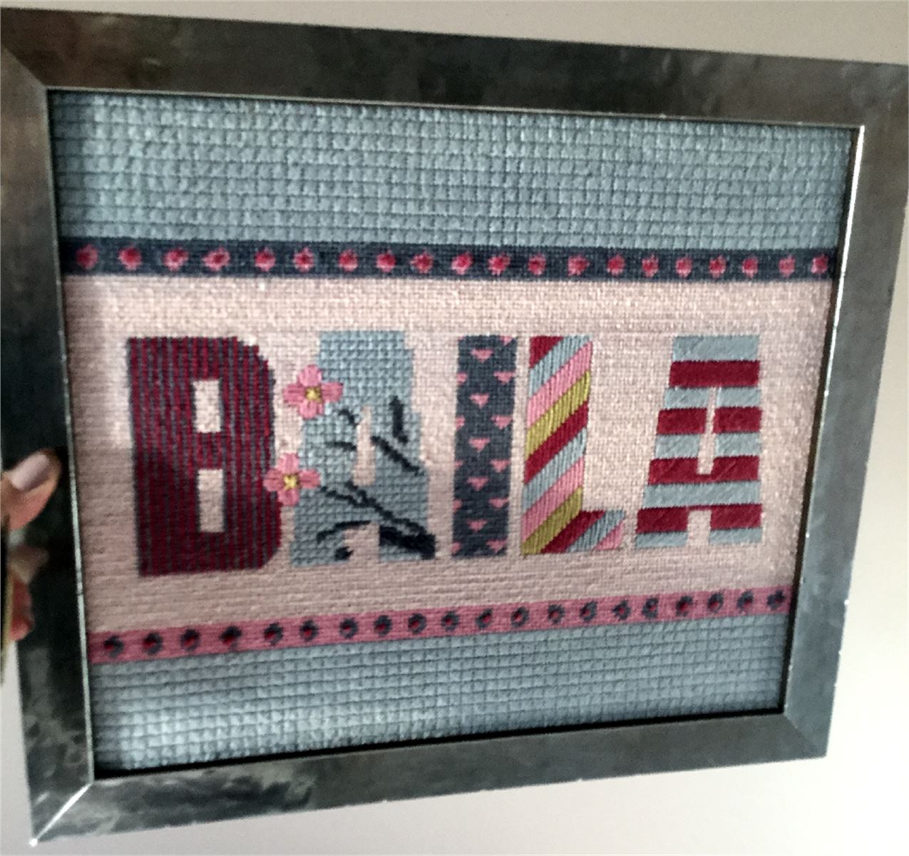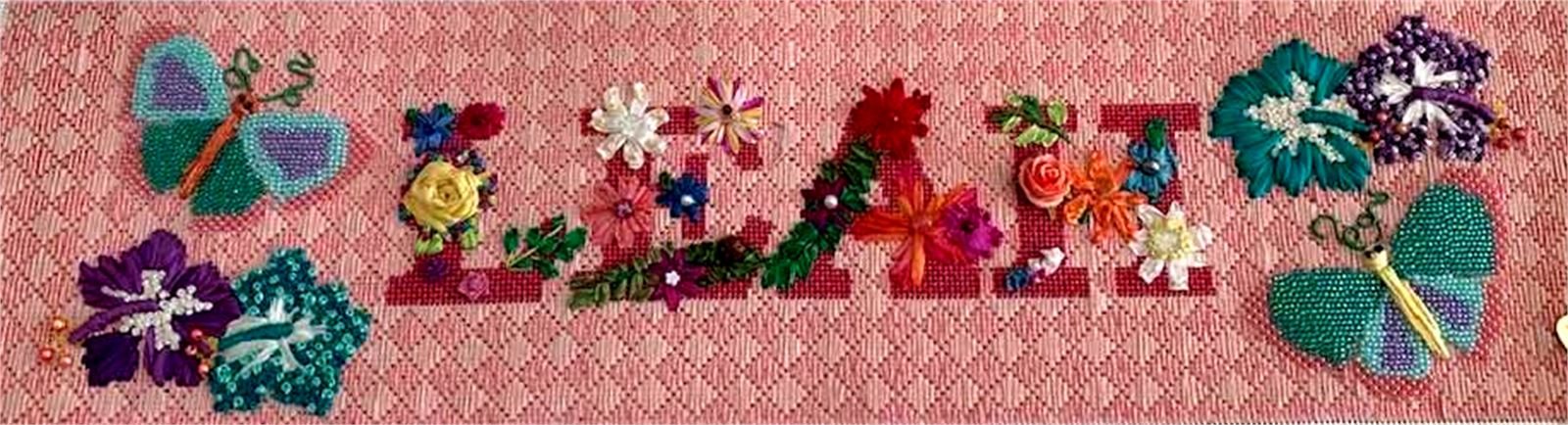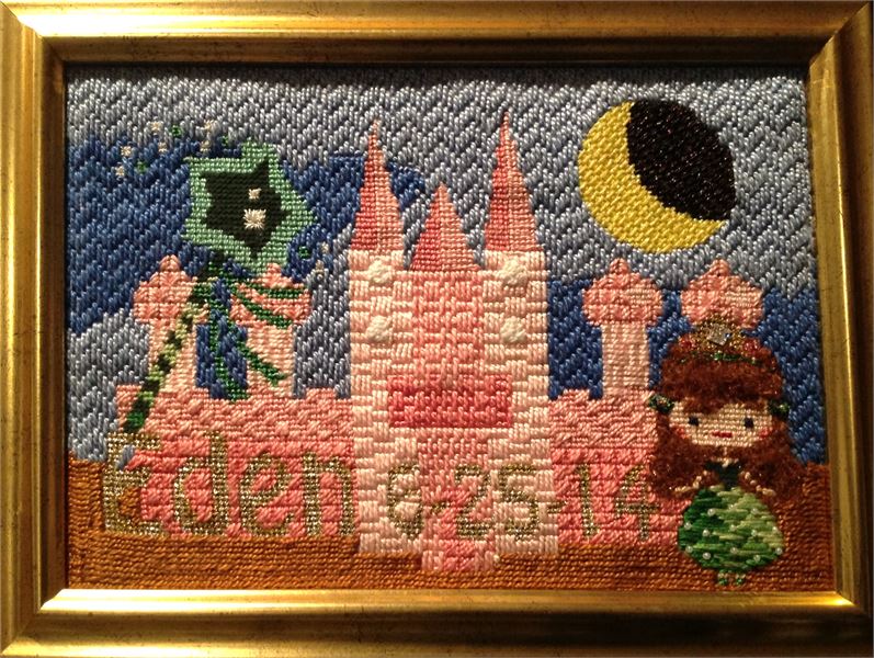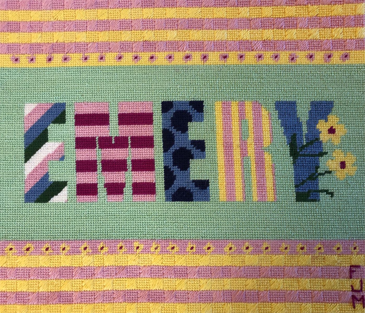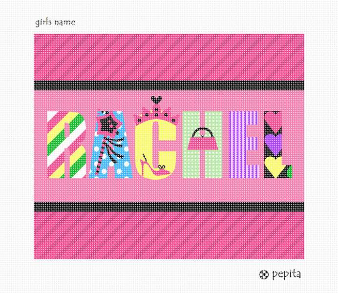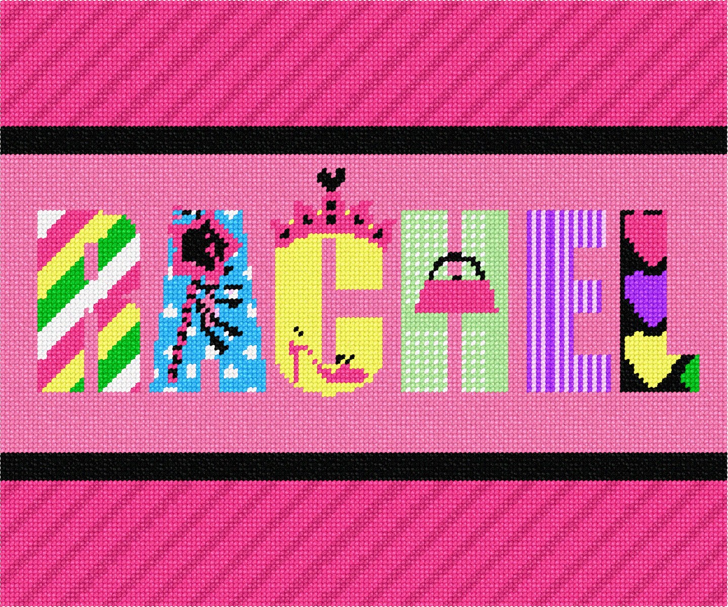 A personalized girl's name in needlepoint. Stitch the magic wand, pocketbook, high heel shoe, and of course, a crown, for your princess.