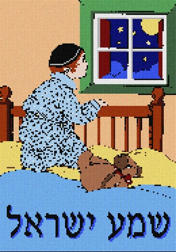 A boy in pajamas looks out the window at the full moon, ready to go to sleep. The words "Shema Yisrael" in Hebrew appear below the scene.