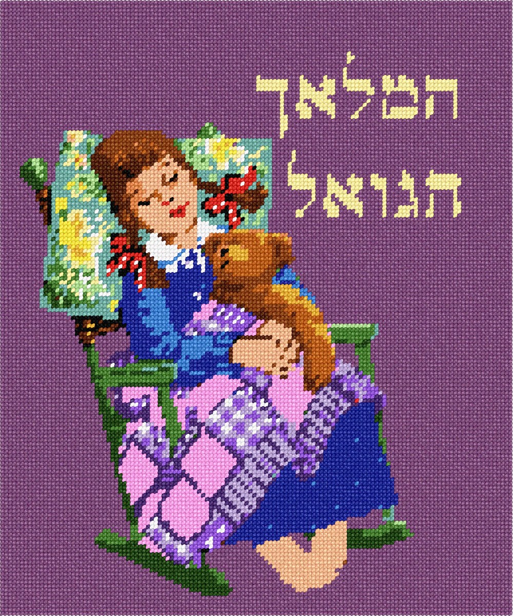 A little girl is dozing with her teddy on a green rocking chair. Her braided hair is adorned with red and white polka dot ribbon bows. She is covered in a patchwork quilt, and her head is resting on a floral pillow. The prayer of "HaMalach HaGoel" is recited after Shema at bedtime.