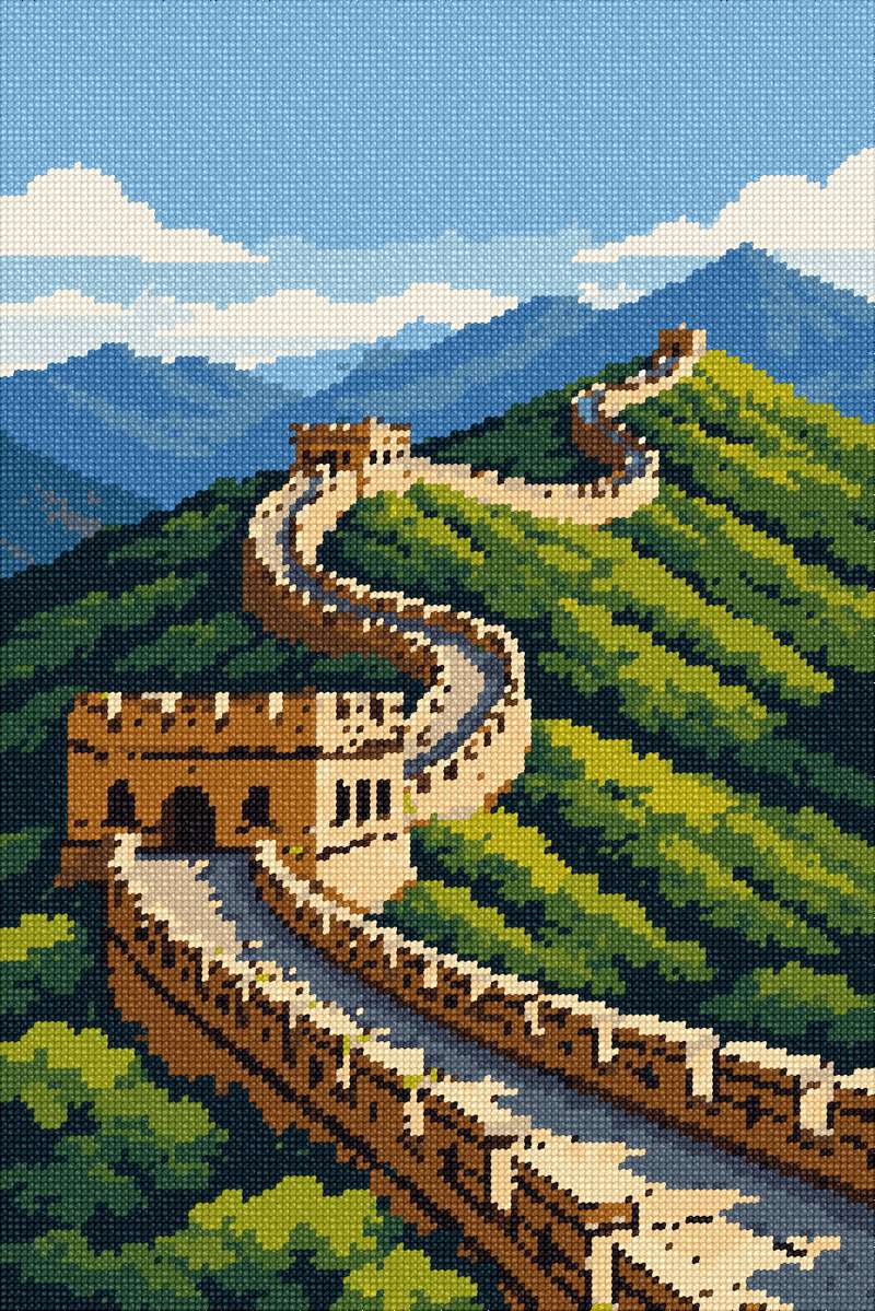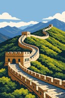 The image showcases the majestic expanse of the Great Wall of China winding over lush, undulating hills against a backdrop of clear blue sky. A vibrant palette of earthy greens and browns contrasts with the sky, evoking a serene and timeless atmosphere. The composition captures the sprawling architecture gracefully snaking through the landscape, highlighting both its grandeur and harmony with nature.