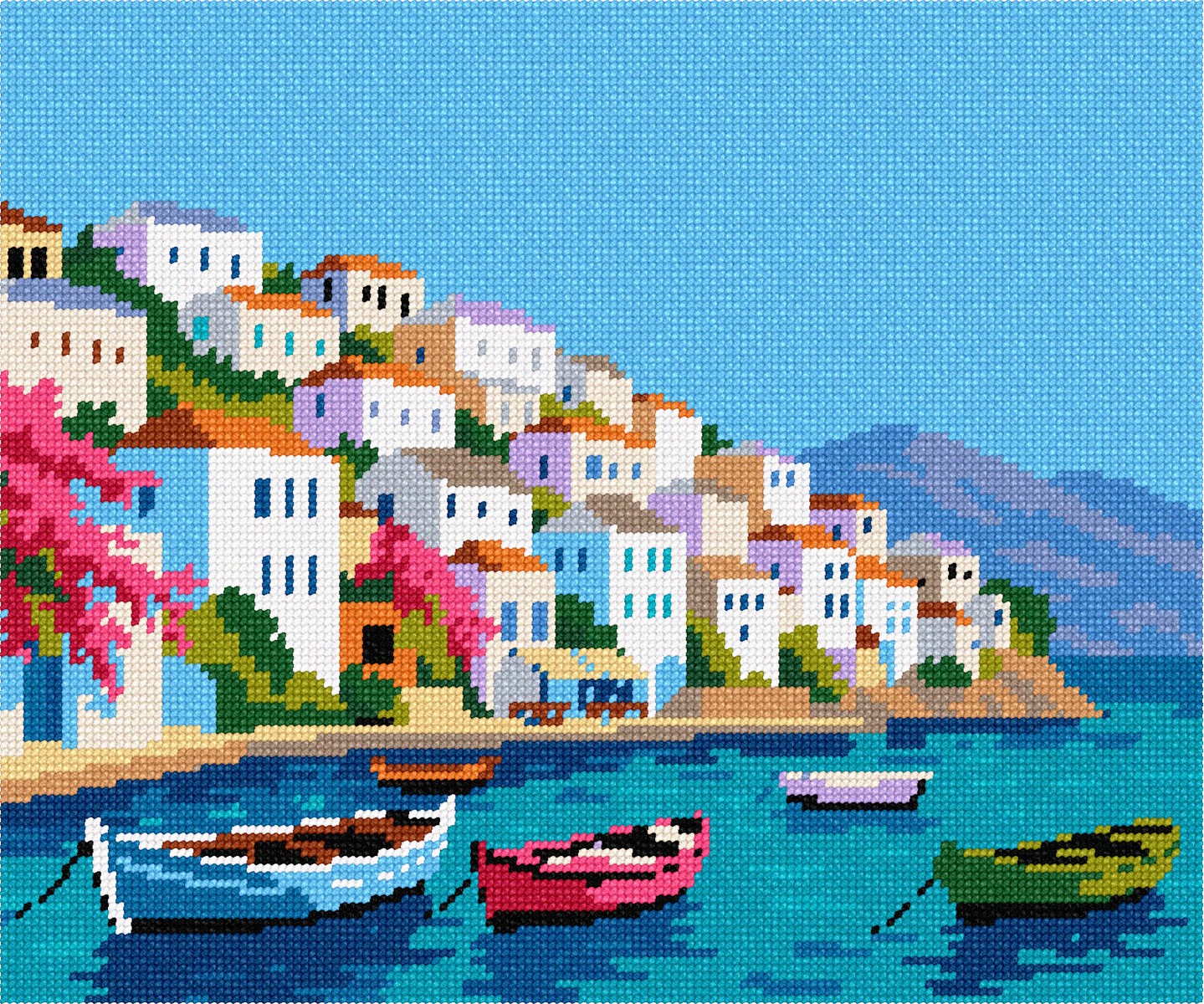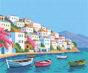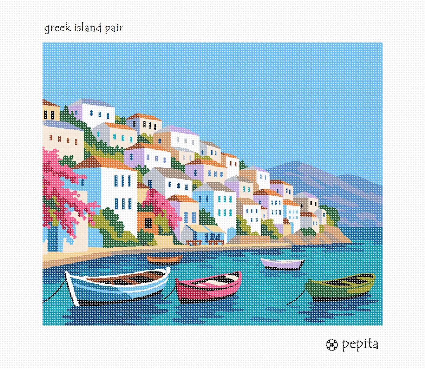 What a glorious secenery to stitch. From the serene waters and boats to the blooming bougainvillea, this island scene is a perfect holiday gift. See the coordinating needlepoint design called Greek Island.