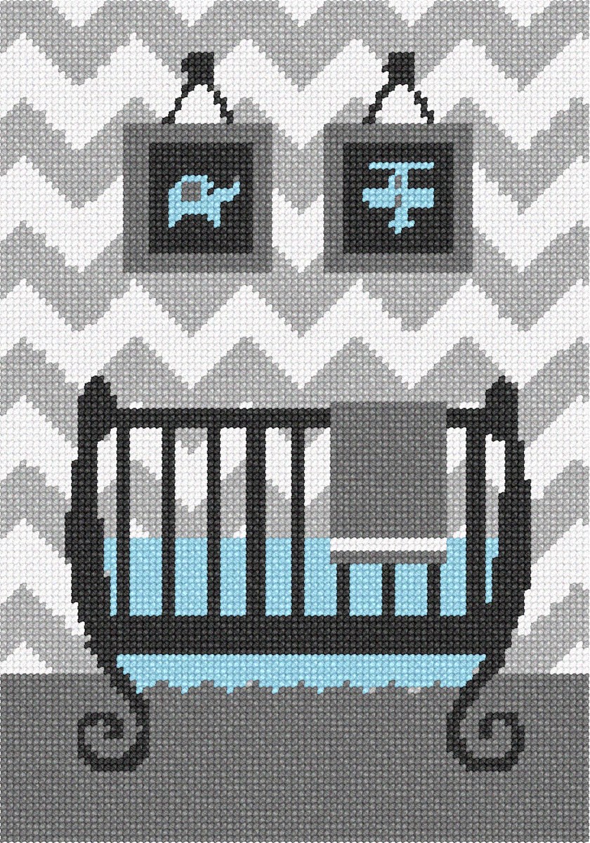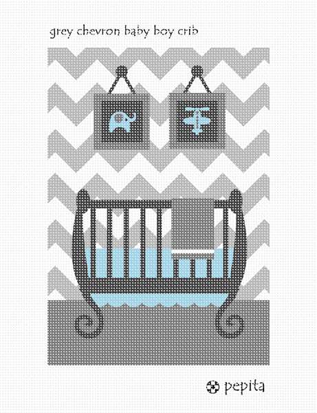 An updated baby boys room in grey and white chevron. Look at baby layette items on sale today. All have chevron pattern. Grey is the new baby blue. The artist designed this when she became a grandmother for the first time. She realized that the updated look in baby nurseries is chevron. She designed unisex and baby girl designs as well. Becoming a grandmother is worth more than any money in the world.