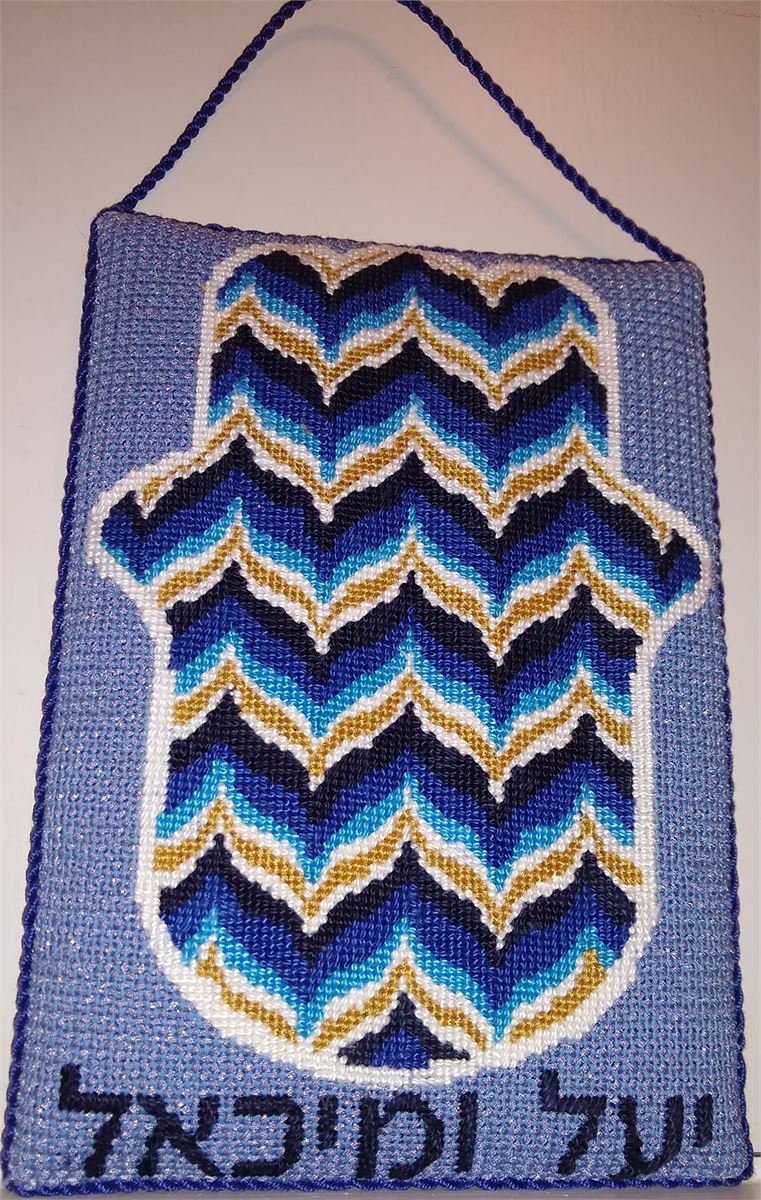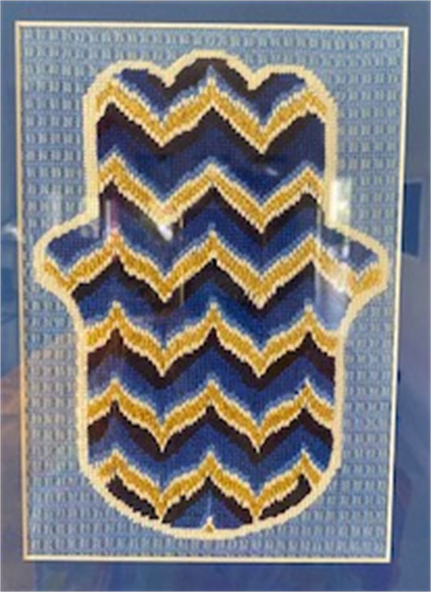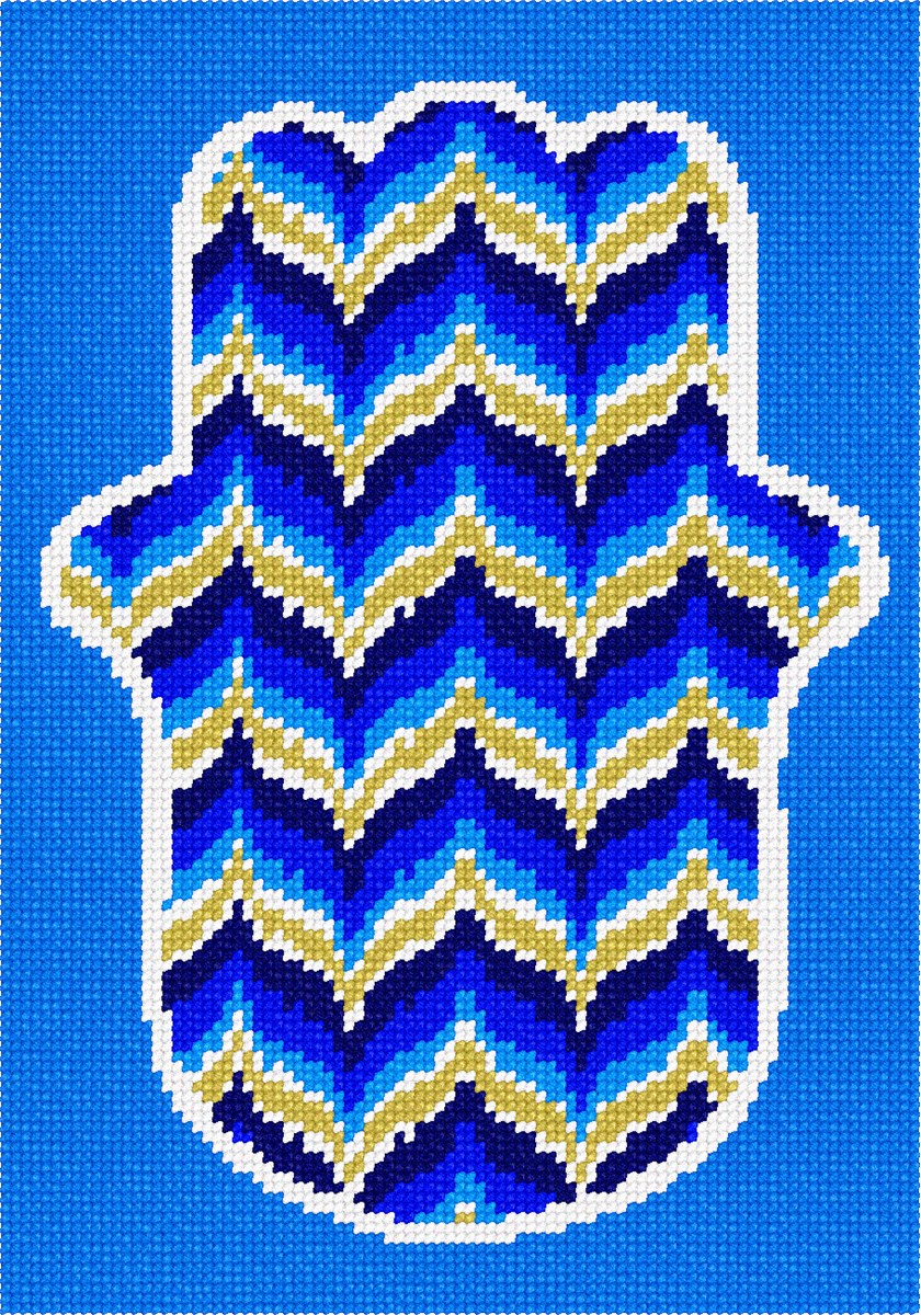 Hamsa in bargello pattern in colors of royalty. A hamsa is a palm-shaped amulet popular throughout the Middle East and North Africa and commonly used in jewelry and wall hangings. Bargello is a type of needlepoint embroidery consisting of upright flat stitches laid in a mathematical pattern to create motifs. The name originates from a series of chairs found in the Bargello palace in Florence, which have a "flame stitch" pattern. Traditionally, Bargello was stitched in wool on canvas. Embroidery done this way is remarkably durable. It is well suited for use on pillows, upholstery and even carpets, but not for clothing. In most traditional pieces, all stitches are vertical with stitches going over two or more threads.