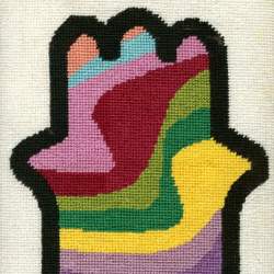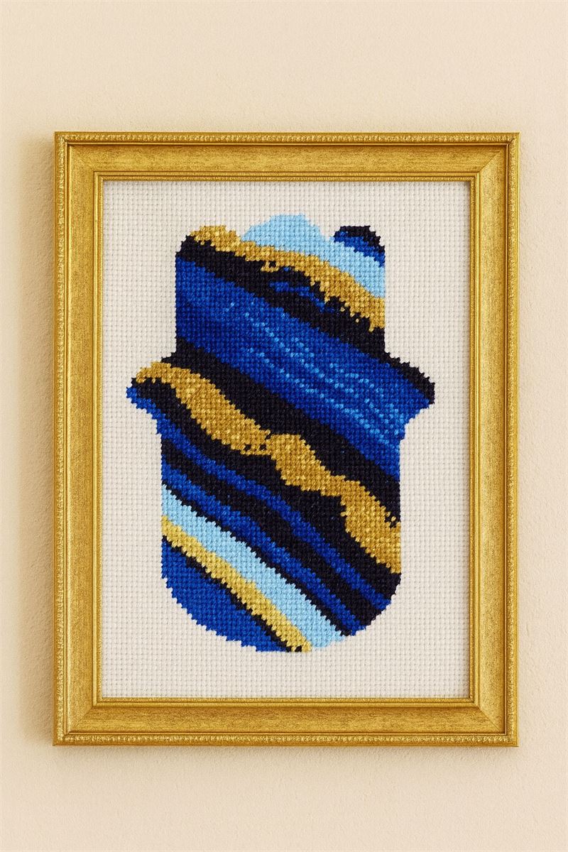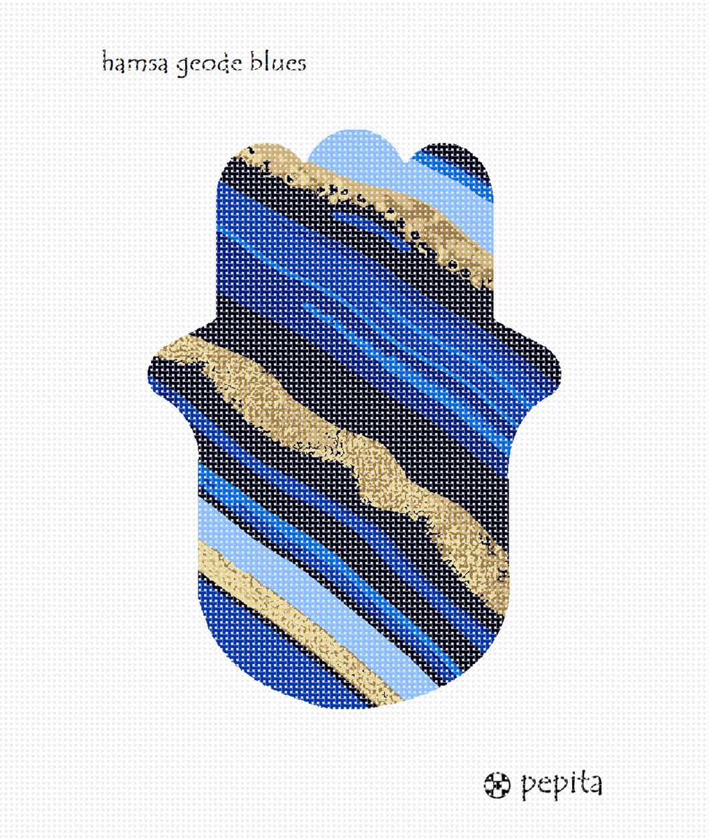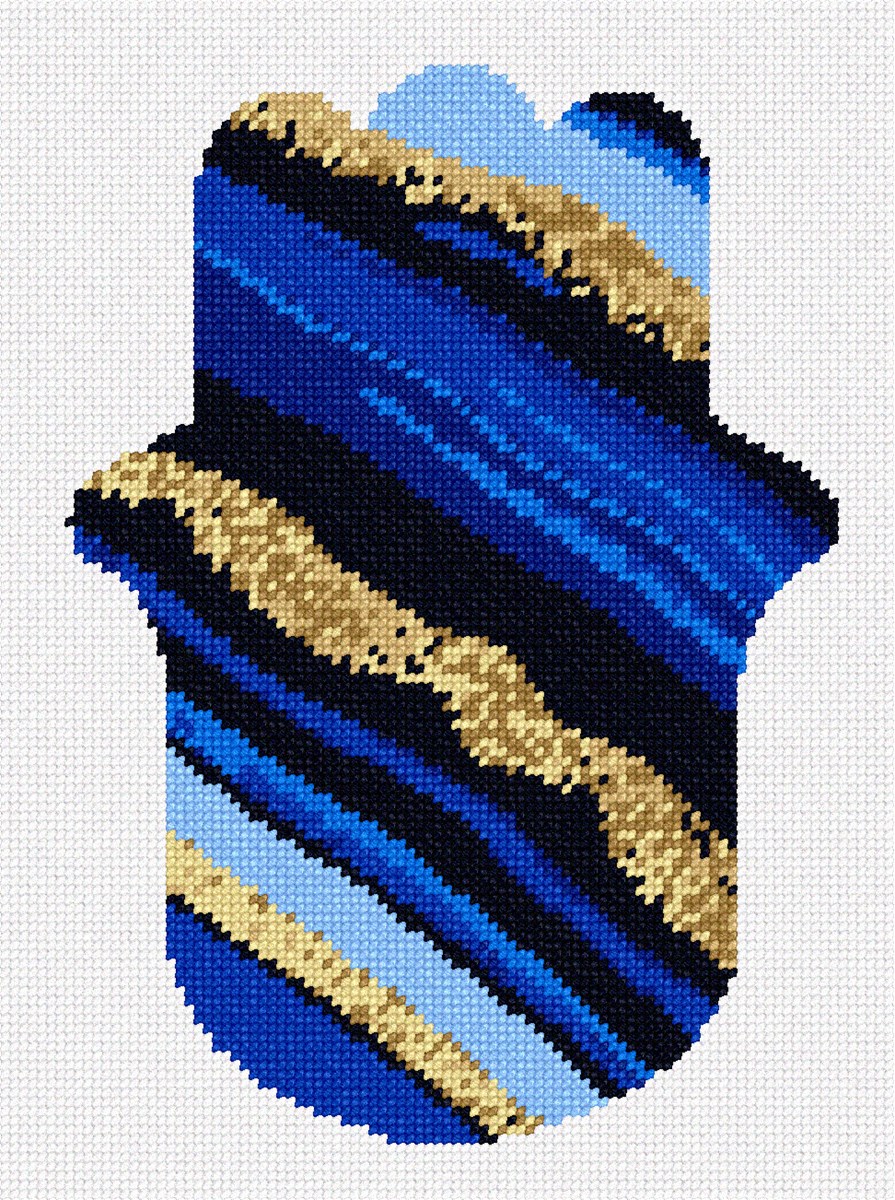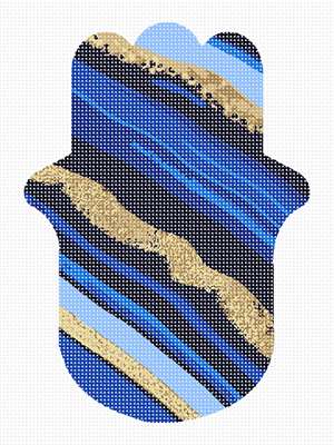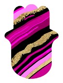 A hamsa is a palm-shaped amulet popular throughout the Middle East and North Africa and commonly used in jewelry and wall hangings. A geode is a stone having a cavity lined with crystals or mineral matter. Most geodes contain clear quartz crystals. Geodes are found all over the world especially in desert regions.This summer I experimented with resin art to create geode looks on glass. That inspired me to design tefillin, tallit, hamsas, and challah covers with geode characteristics. This one coordinates with a Challah cover for Shabbat and Matzoh cover for Passover.