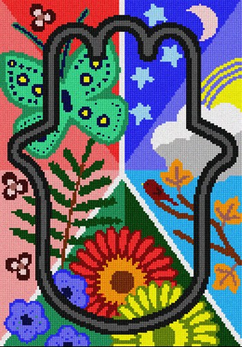 The palm-shaped amulet that defends against the evil eye. This design includes colorful drawings with nature themes, divided into five segments: 1) Moon and stars in night sky. 2) Sun and clouds, bird on branch with leaves. 3) Colorful flowers. 4) Ferns and miniature flowers. 5) Pretty butterfly.