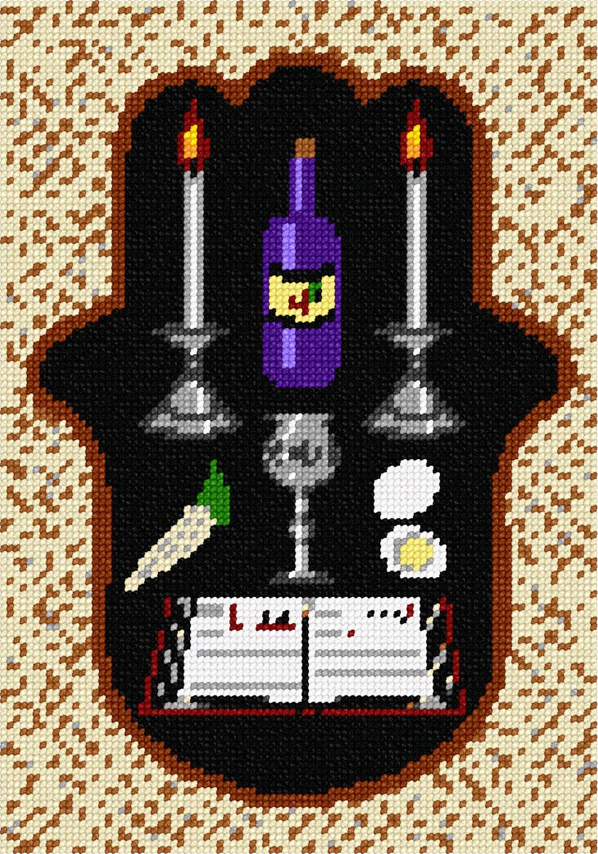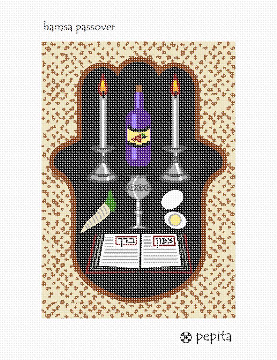 A hamsa is a palm-shaped amulet popular throughout the Middle East and North Africa and commonly used in jewelry and wall hangings. Celebrate the Passover Seder with this special hamsa. Silver candlesticks, Kiddush wine, Elijah's Cup, Marror, hard boiled eggs, and a Hagaddah adorn the Seder. The background is Matzoh style.