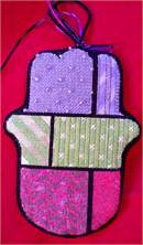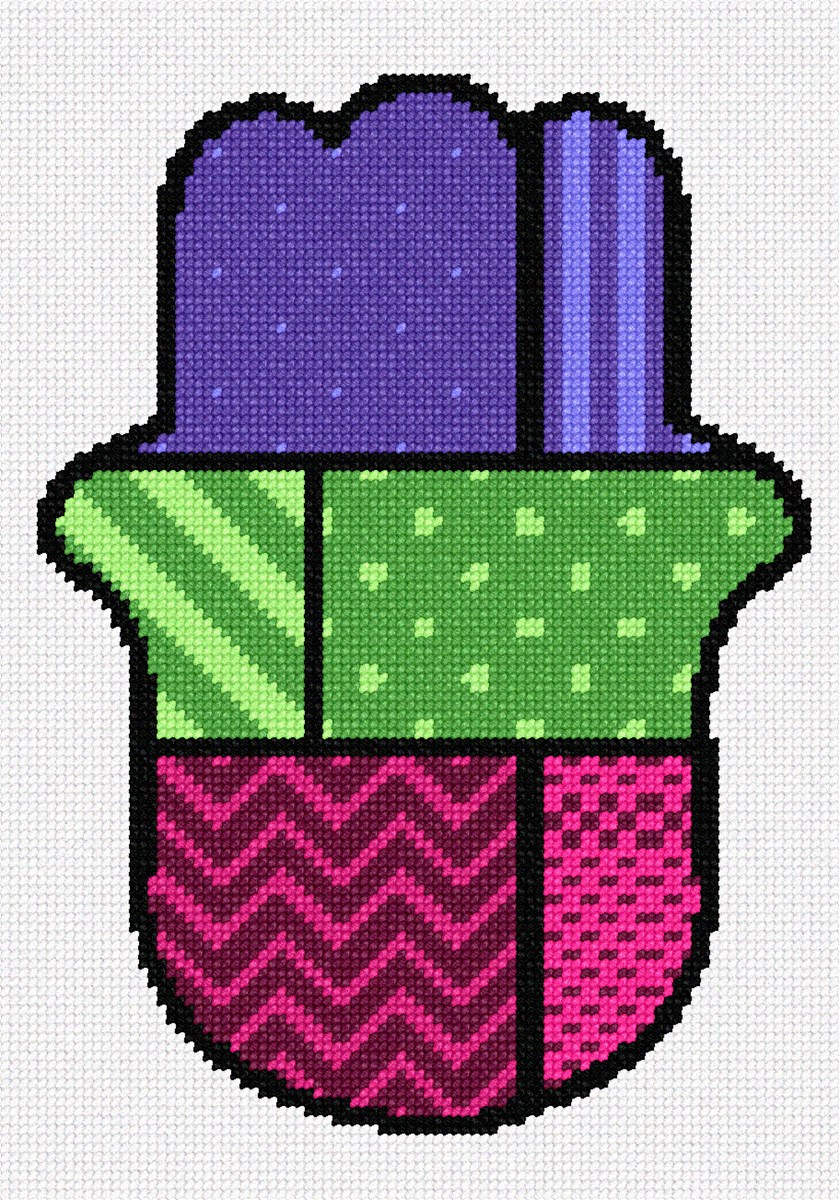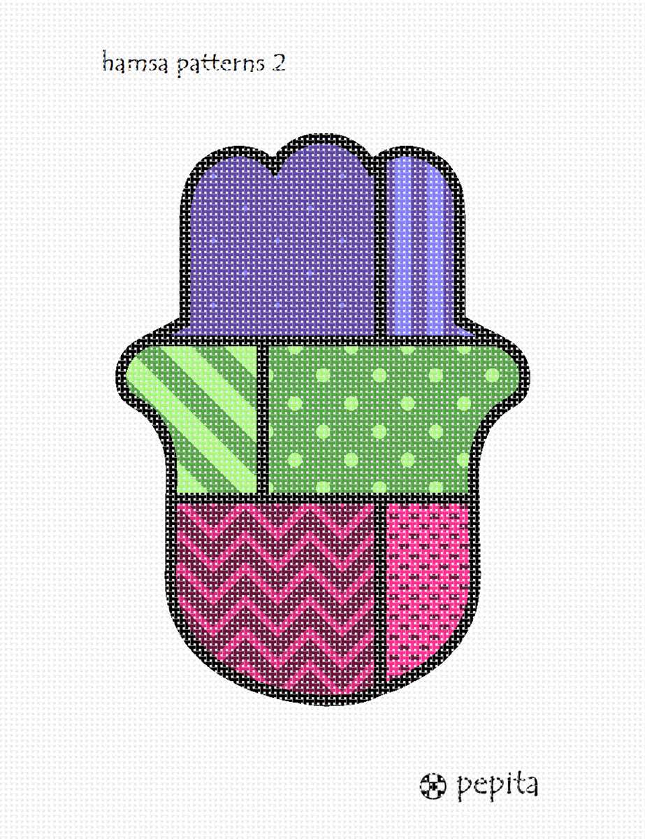 Geometric patterns are very vogue in needlepoint today. A hamsa is a palm-shaped amulet popular throughout the Middle East and North Africa and commonly used in jewelry and wall hangings. This design is available in three different color choices.