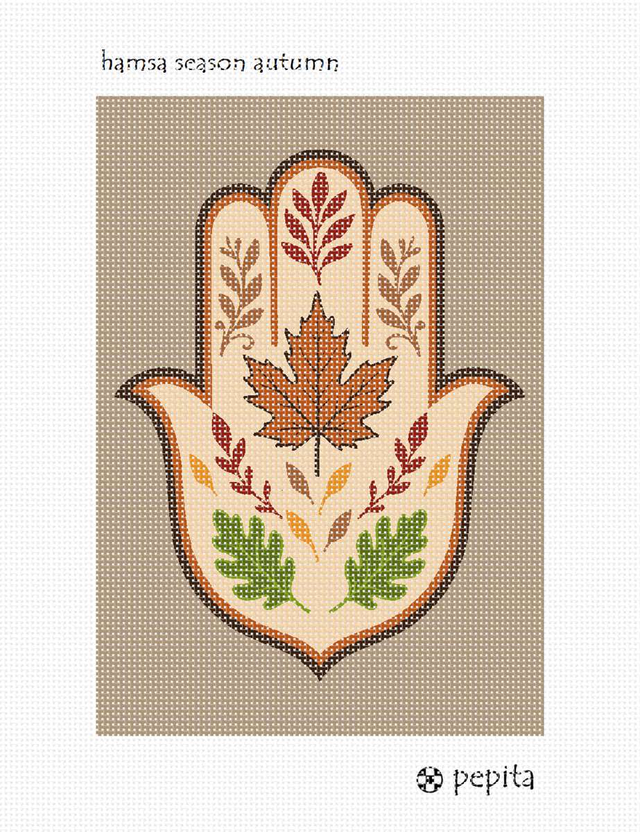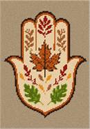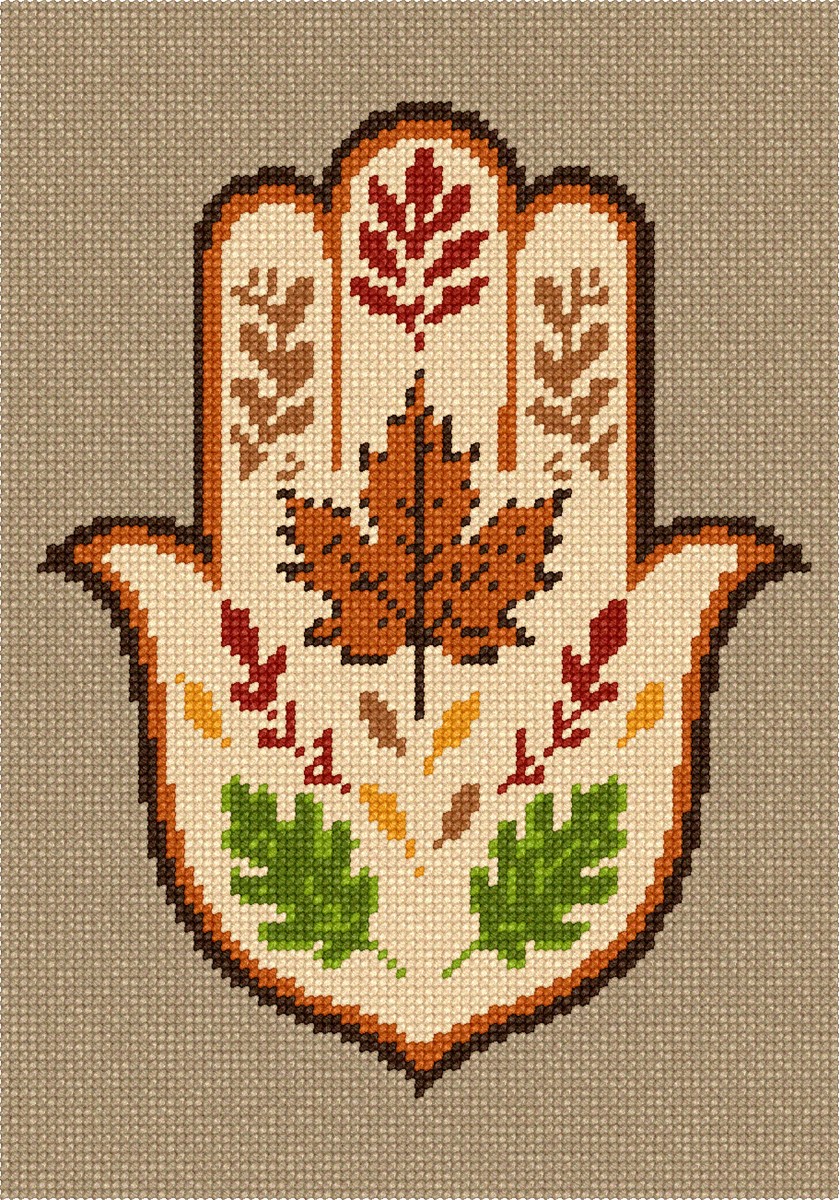 Stitch a hamsa for all four seasons. This one is for autumn. Enjoy the fall-foliage colors of the leaves.