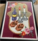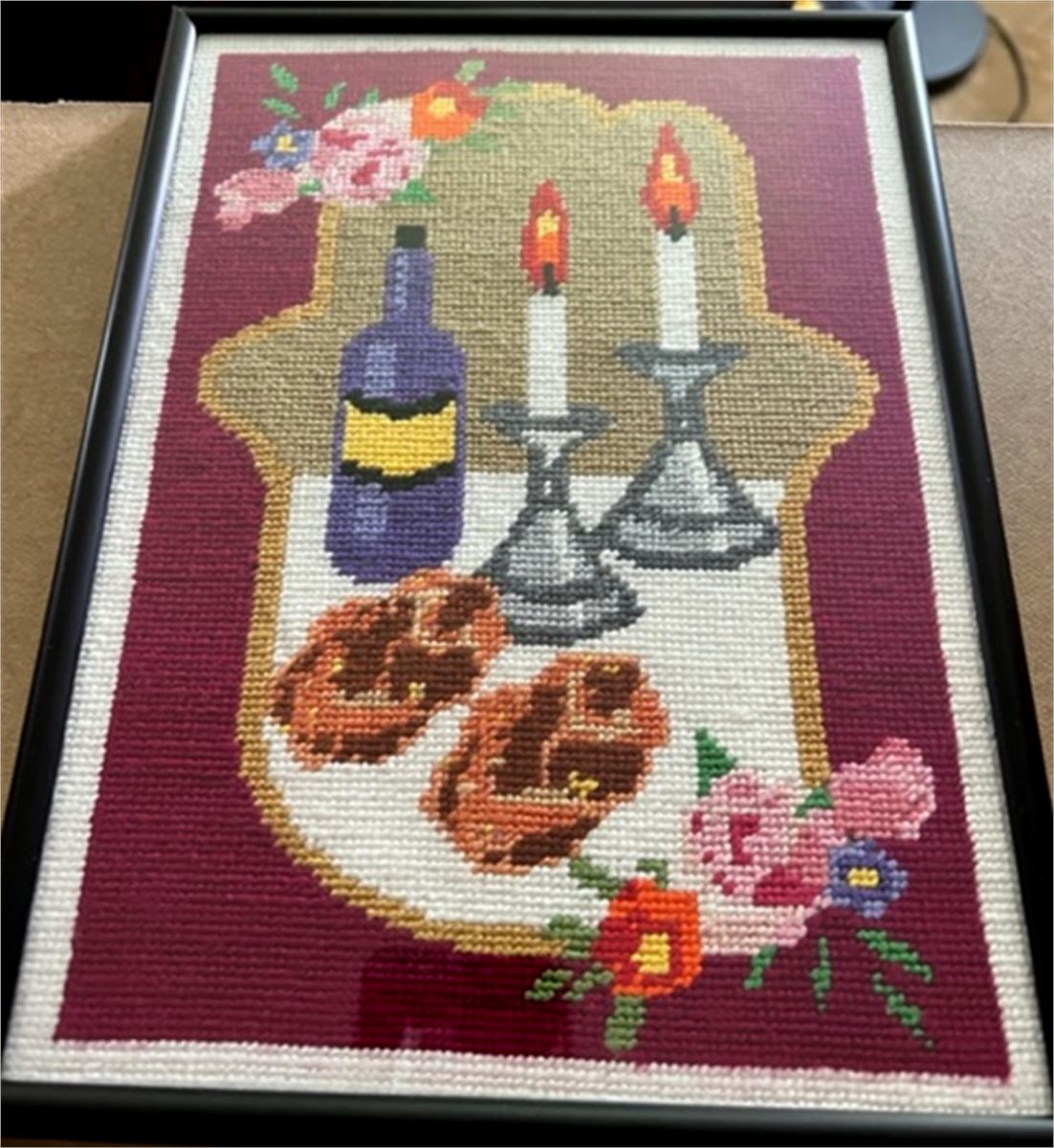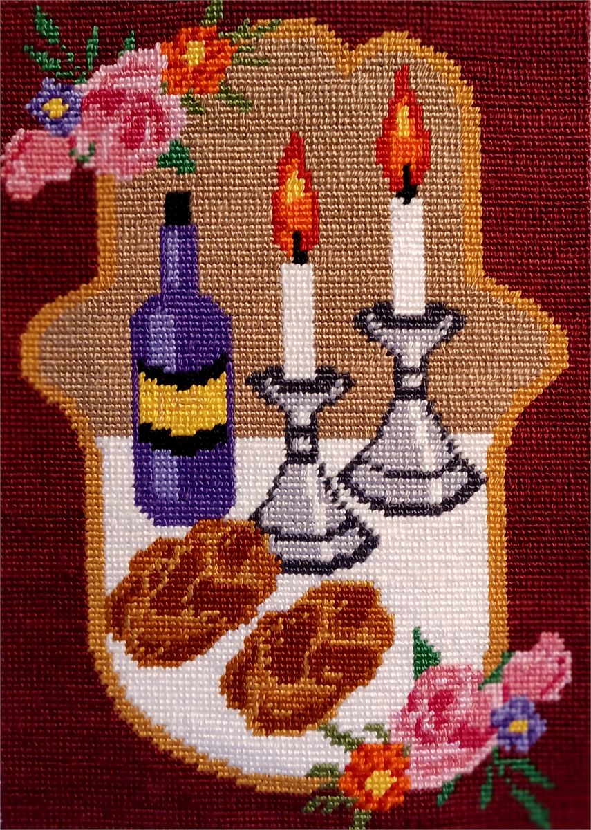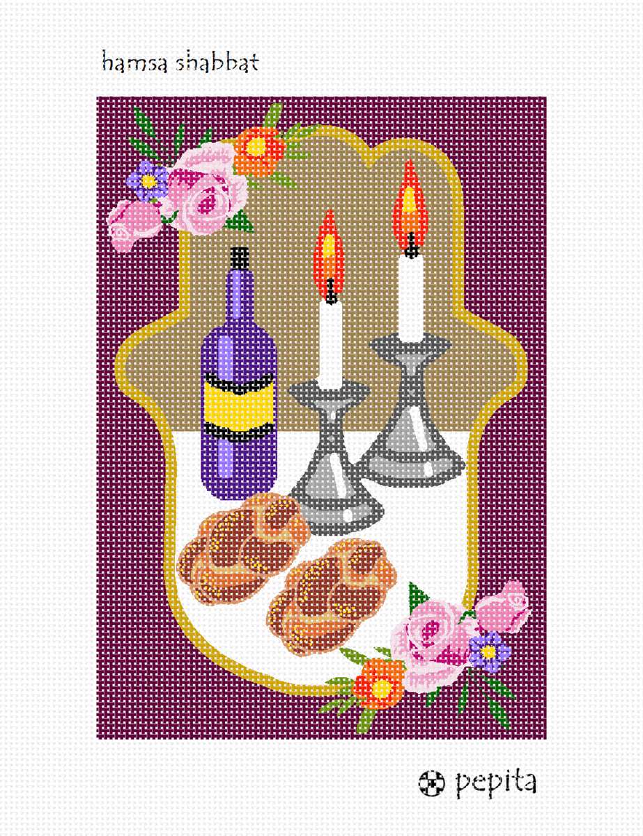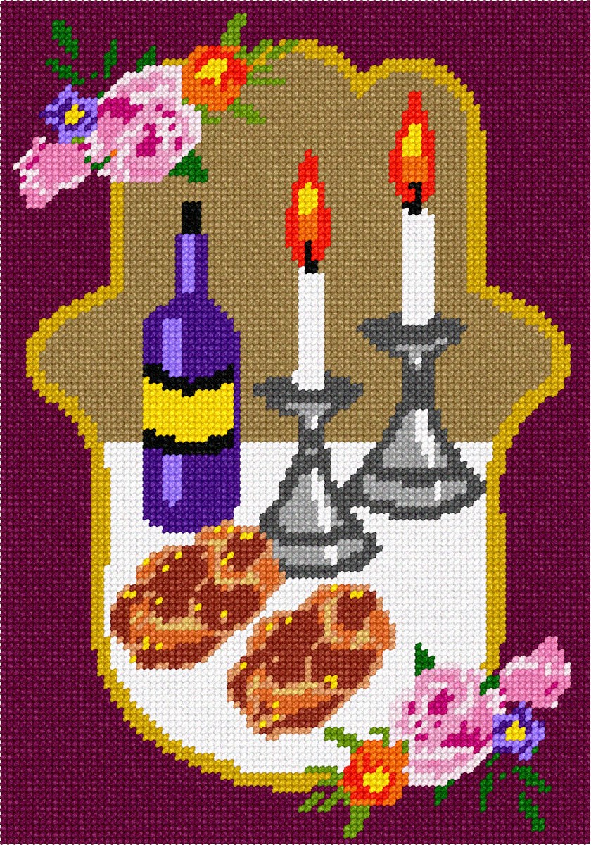A hamsa is a palm-shaped amulet popular throughout the Middle East and North Africa and commonly used in jewelry and wall hangings. Celebrate the holy day of the week, Shabbos, with this special hamsa. Silver candlesticks, challah loaves, and Kiddush wine adorn the Shabbos table.