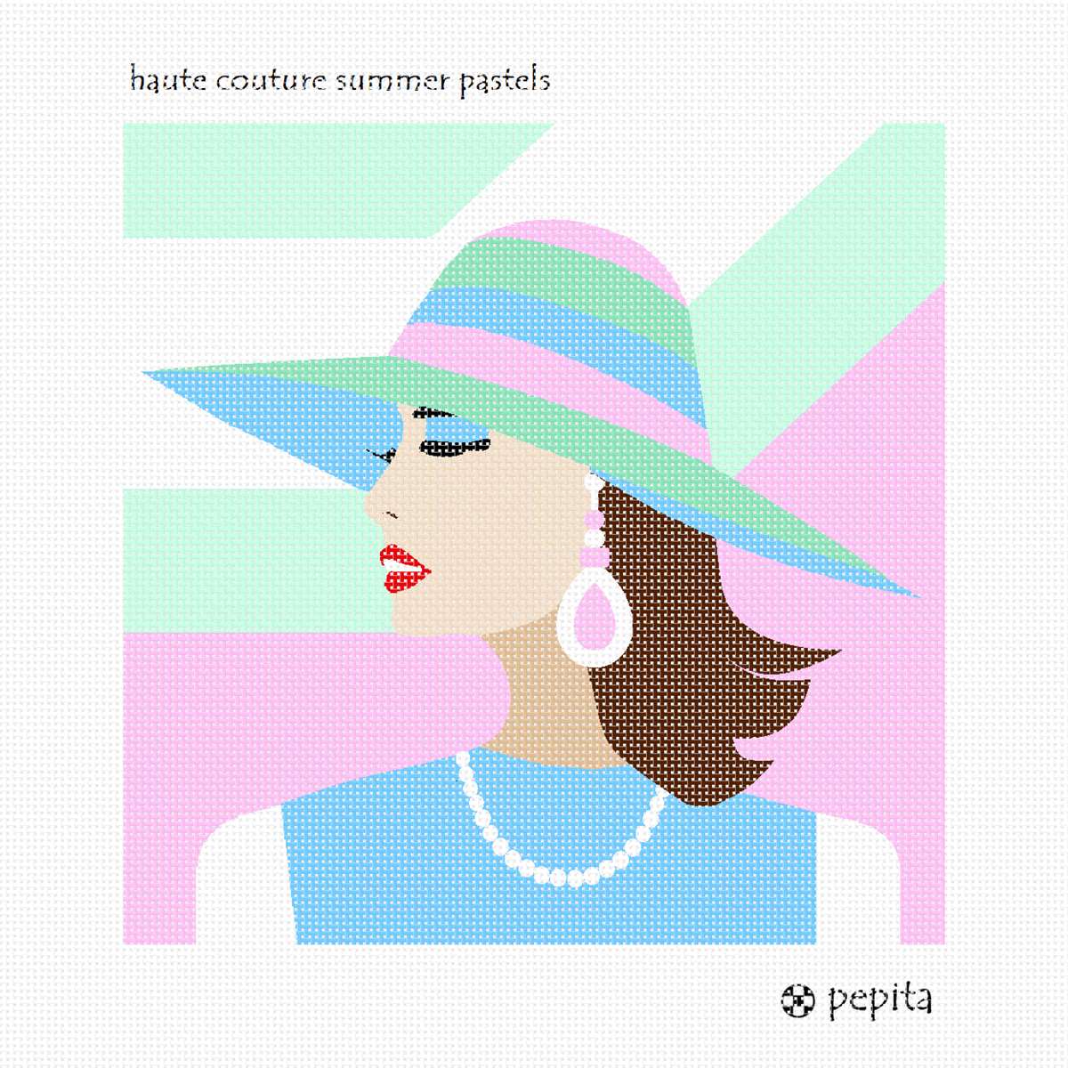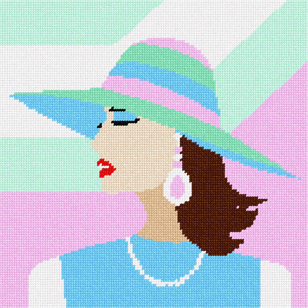 A fancy lady dressed up for summer. The pastel background along with her striped hat make her dressed up for an event or a party. She is even wearing her pearl necklace and a teardrop earring.