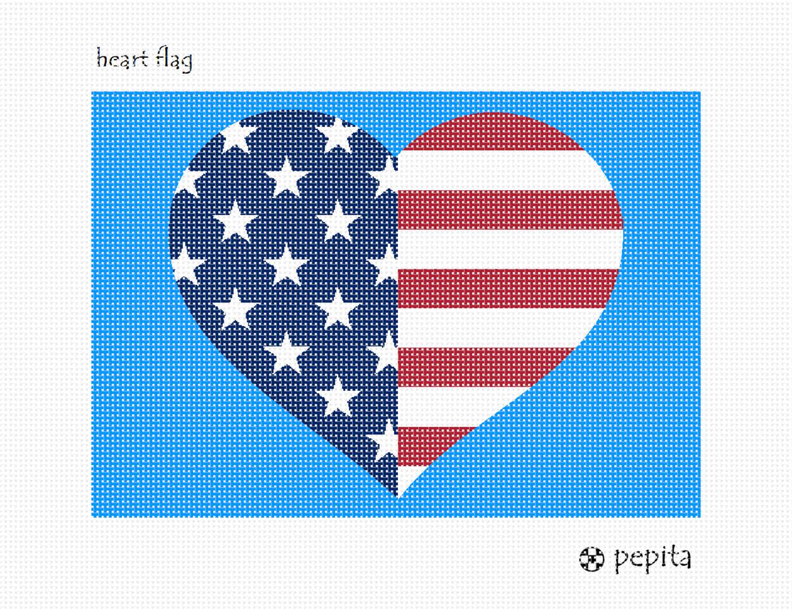 The national flag of the United States of America in a heart cutout shape. Thirteen equal horizontal stripes of red (top and bottom) alternating with white, with a blue rectangle in the canton bearing fifty small, white, five-pointed stars. The fifty stars on the flag represent the 50 states and the 13 stripes represent the original thirteen colonies that rebelled against the British monarchy and became the first states in the Union. Stitch this patriotic needlepoint.