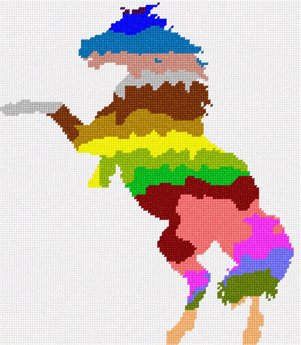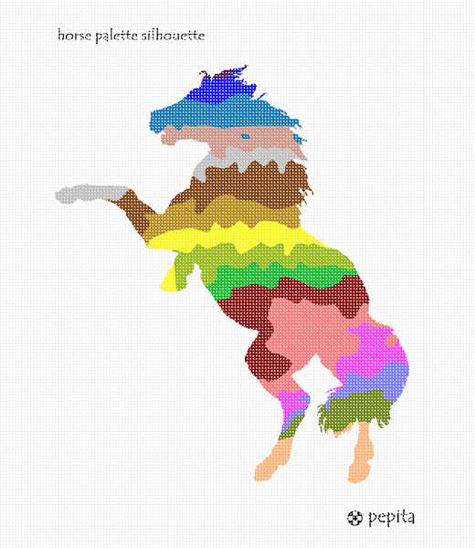The shape of a horse filled with colorful stripes. There are many animals in our palette silhouette series. This horse is adorable and perfect for a beginner. Purchase as a kit, or buy just the plain canvas if you have many color threads in your stash.