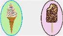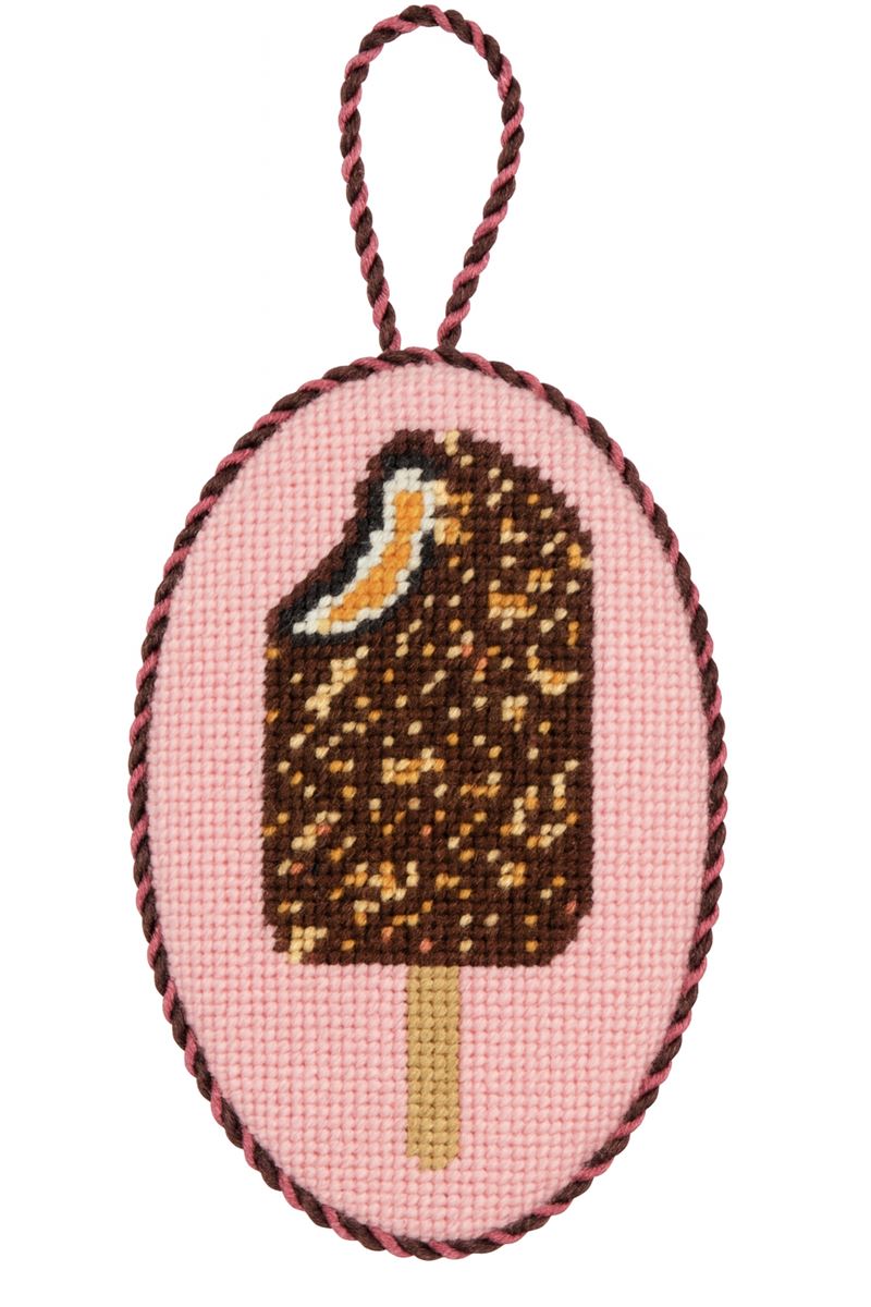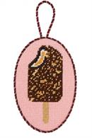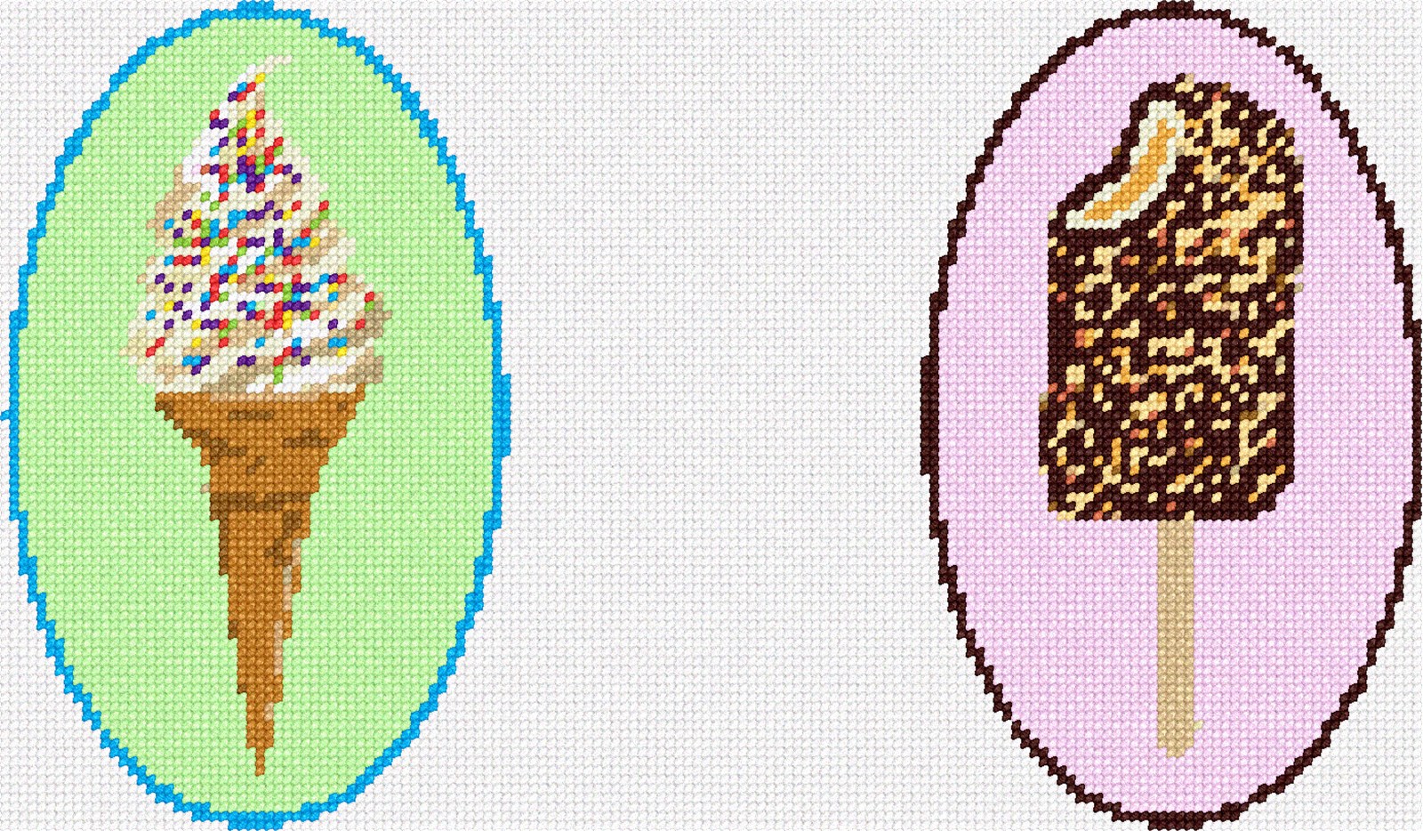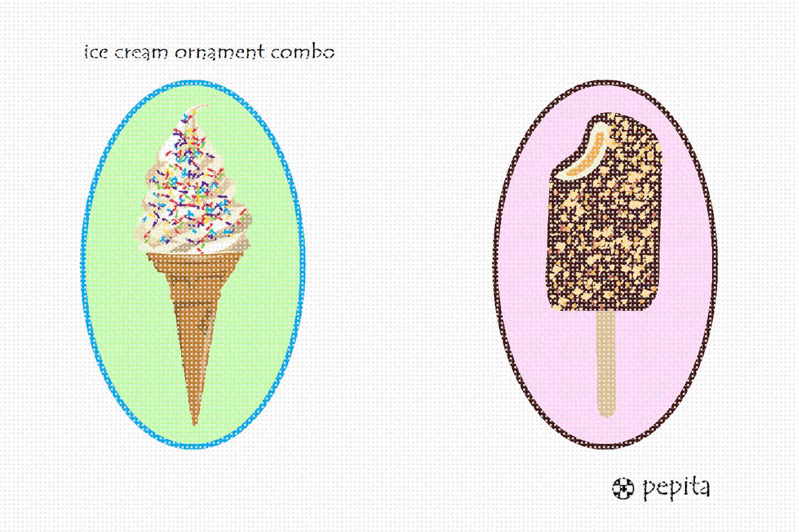 Two ice cream treats in a combination set of ornament needlepoint canvases. One is a vanilla ice cream cone with sprinkles, and the other is a nougat bar with chopped nuts and chocolate coating on the frozen eclair. Yum! 18 mesh.