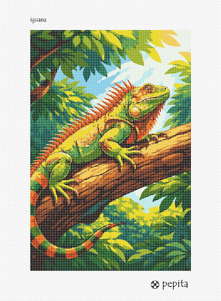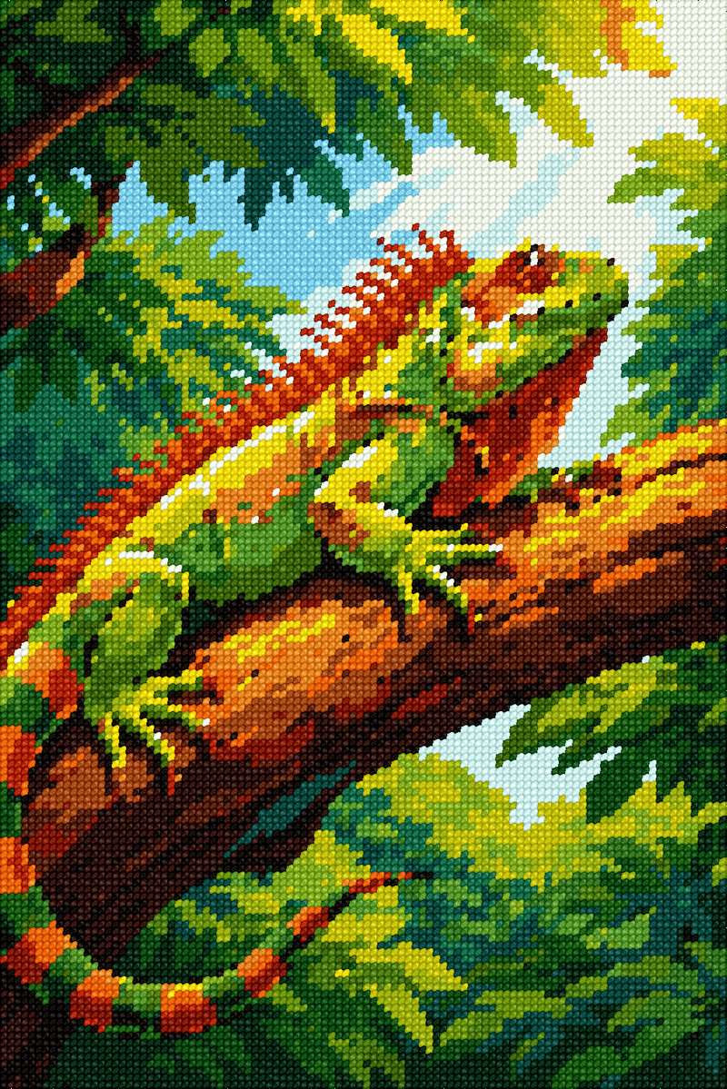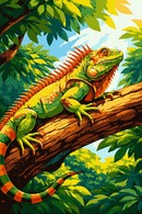 A striking iguana rests majestically on a tree branch, surrounded by lush foliage that brings the natural world to life. Vibrant greens, rich browns, and warm oranges dominate the palette, creating a vivid and lively atmosphere. The artwork captures intricate details with a dynamic composition that draws the eye through a harmonious interplay of color and light.