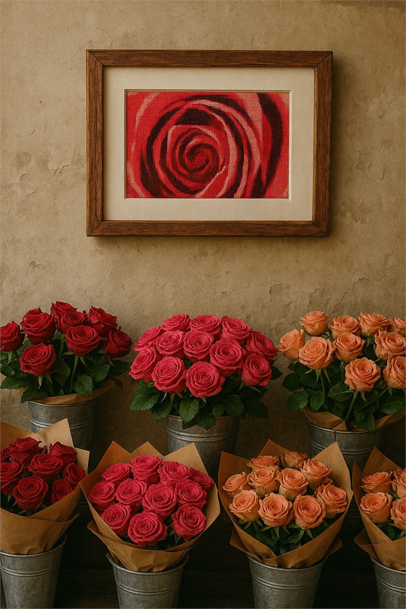 A closeup of a red rose. Red roses symbolize love and romance. Pink roses symbolize gratitude, grace, admiration, and joy. Orange roses symbolize enthusiasm and passion. Yellow roses symbolize friendship. White roses symbolize innocence and purity.