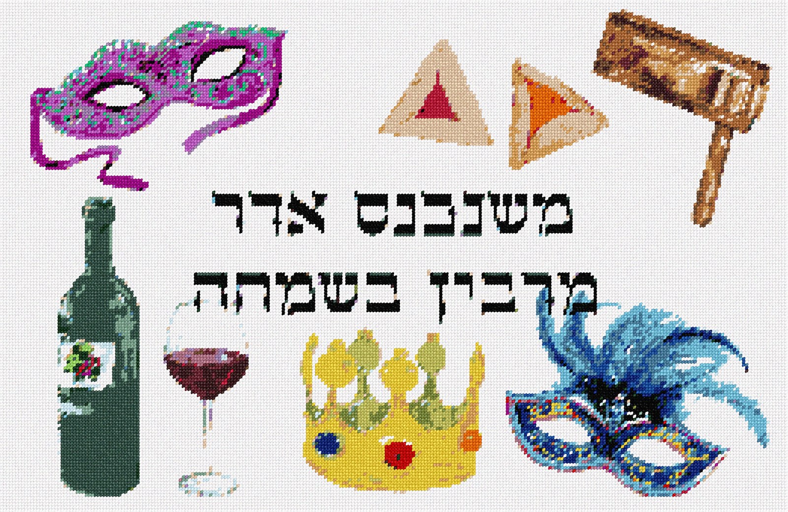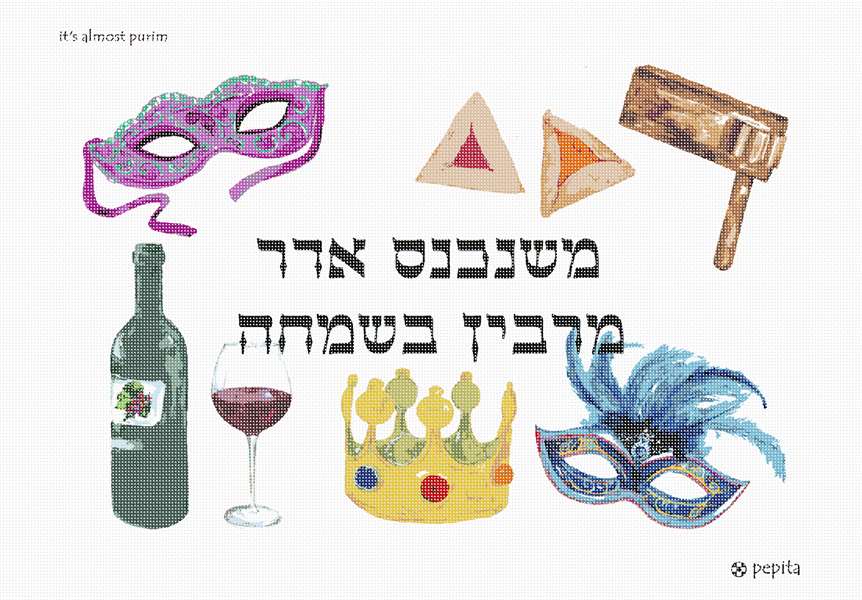 For the holiday of Purim, masks, hamantaschen, wine, and crown. Get into the simcha spirit!