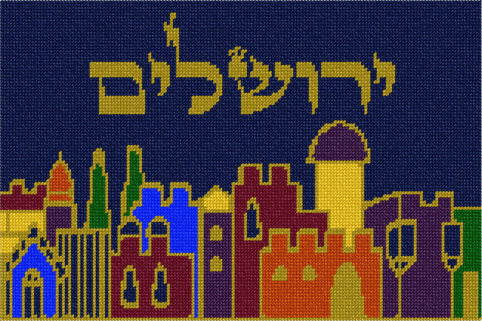 The word "Jerusalem" in gold with the Old City skyline sparkling in the darkness. Stitch as a wall hanging or decor for a Sukkah or study.