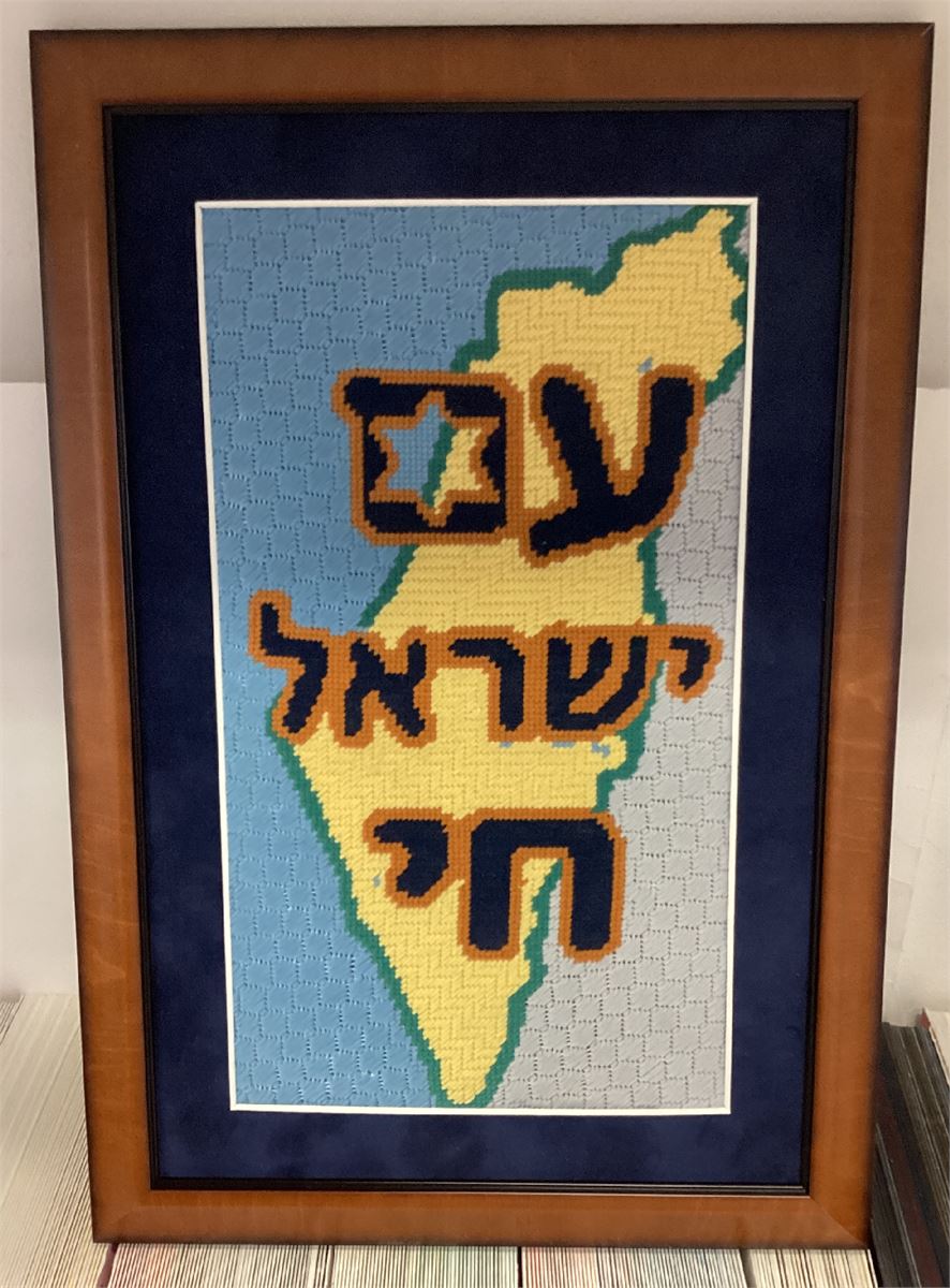 Hebrew for "the Jewish Nation Lives" is stitched above a map of Israel. Chai is the Hebrew word for Life. The gematria is 18.