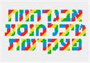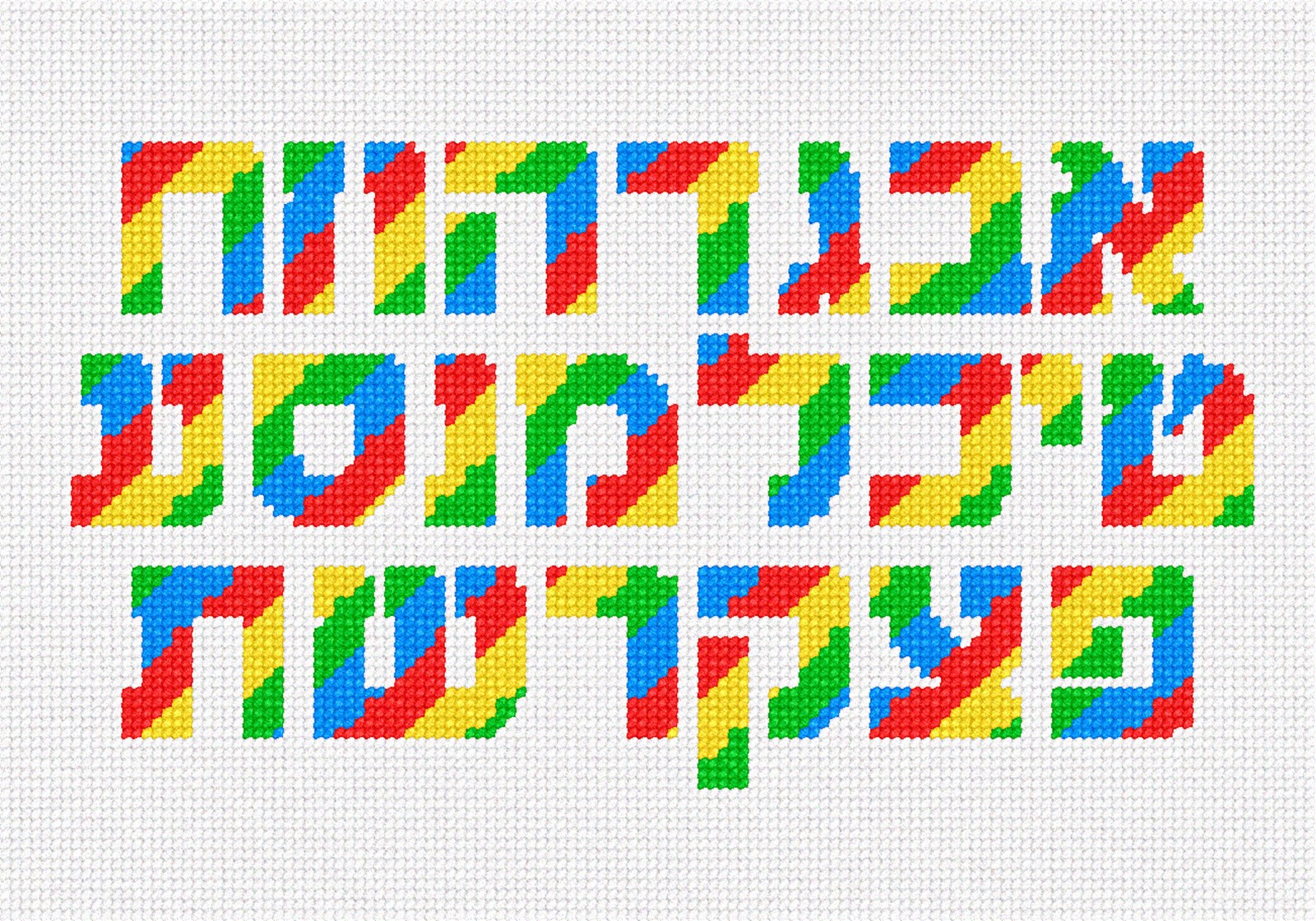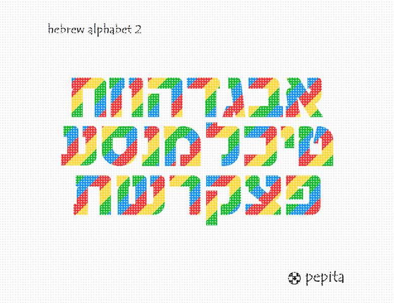 Blocky Hebrew letters striped with primary colors. If you like stripes and cool designs, this one is for you. The Hebrew Aleph Bais is based on 22 letters. This is a basic for every Jewish home. Hebrew (and Yiddish) uses a different alphabet than English. Note that Hebrew is written from right to left, rather than left to right as in English, so Alef is the first letter of the Hebrew alphabet and Tav is the last. The Hebrew alphabet is often called the "alef-bet," because of its first two letters. Note that there are two versions of some letters. Kaf, Mem, Nun, Peh and Tzadeh all are written differently when they appear at the end of a word than when they appear in the beginning or middle of the word. The version used at the end of a word is referred to as Final Kaf, Final Mem, etc.