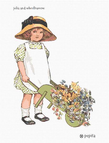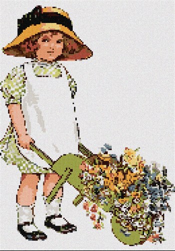 A girl dressed in green gingham trundles a wheelbarrow of flowers to market. Flowers and floral design are among the most popular needlepoint designs. People have been stitching flowers and floral motifs for hundreds of years. Flowers are bright and pleasant, and most have underlying meanings to them.