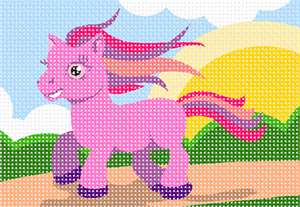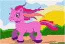 Pink pony skipping merrily down a wee mountain path, her colorful mane and tail flowing in the breeze.