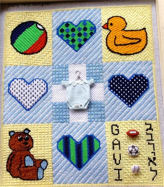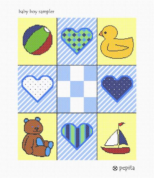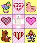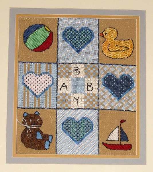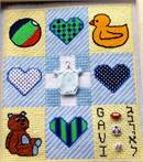A collage of 9 tiles containing baby boy themed artwork. This piece features a beach ball, rubber ducky, sailboat, teddy, and four patterned hearts. The center tile is for you to fill in using your imagination. Or, you can purchase an applique for the center square, this will give the artwork depth and variety.