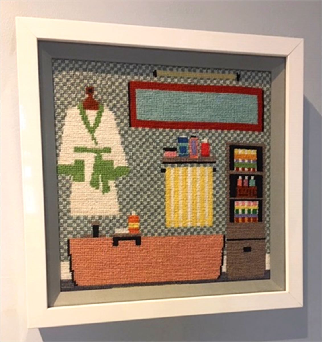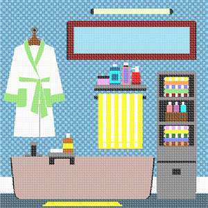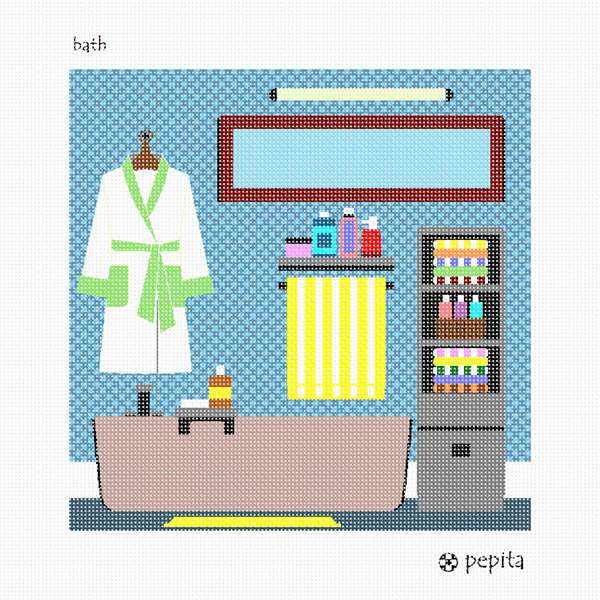 A bathroom scene in needlepoint. A plush bathrobe, coordinating towels, soaps and shampoos, and a matching rug. The only thing missing is the rubber duckie.