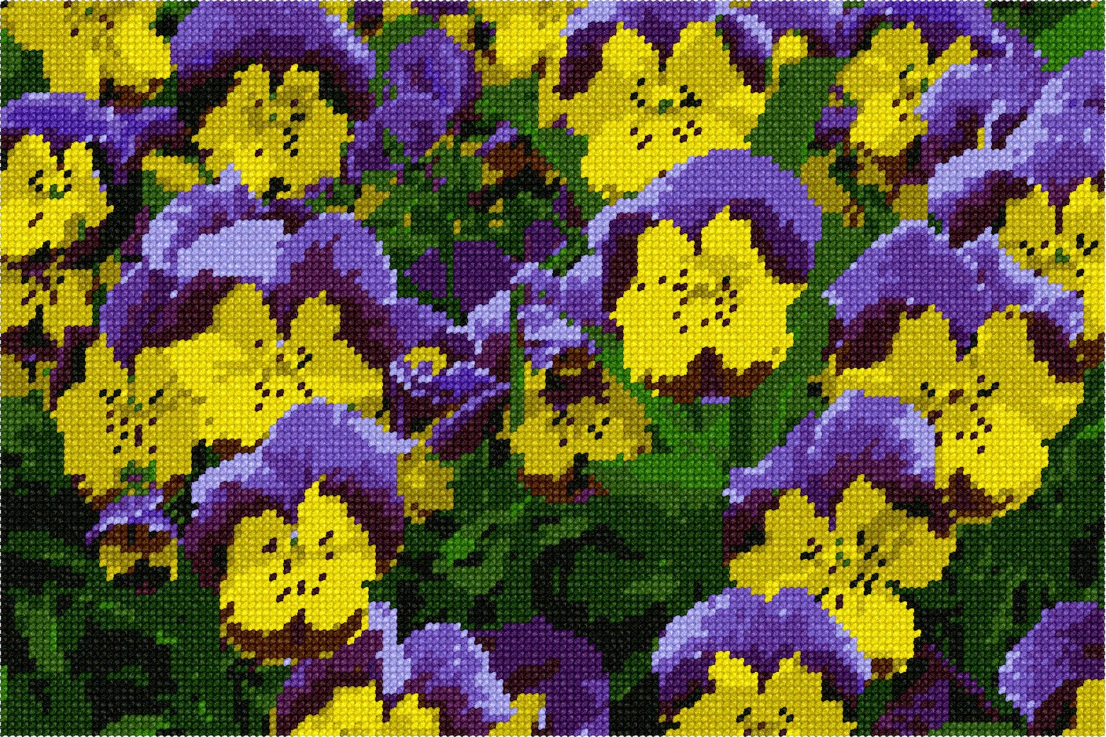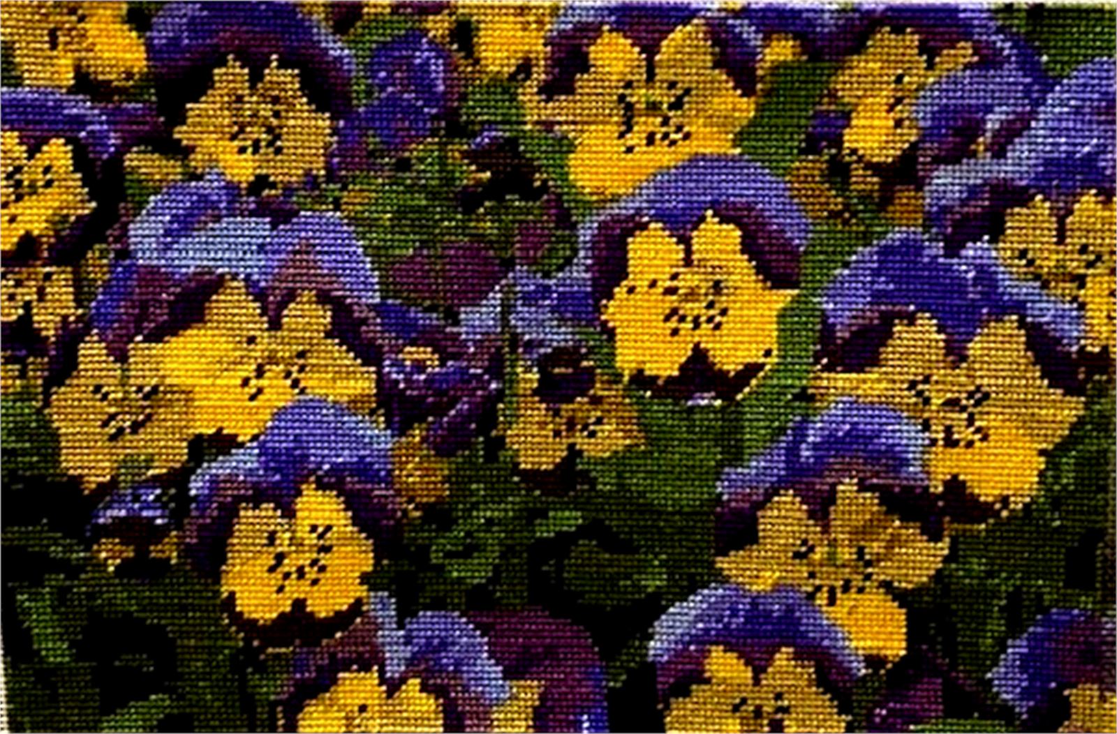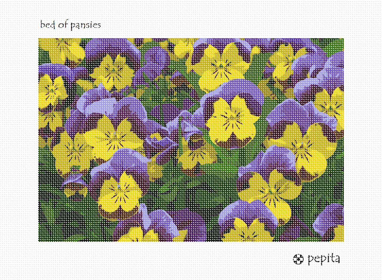 A flowerbed of pansies. The pansy flower symbolizes the love or admiration of one person for another. ... They adopted the pansy as its symbol because the word pansy is from the verb pensee in French meaning to think. Flowers and floral design are among the most popular needlepoint designs. People have been stitching flowers and floral motifs for hundreds of years. Flowers are bright and pleasant, and most have underlying meanings to them.