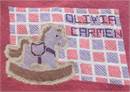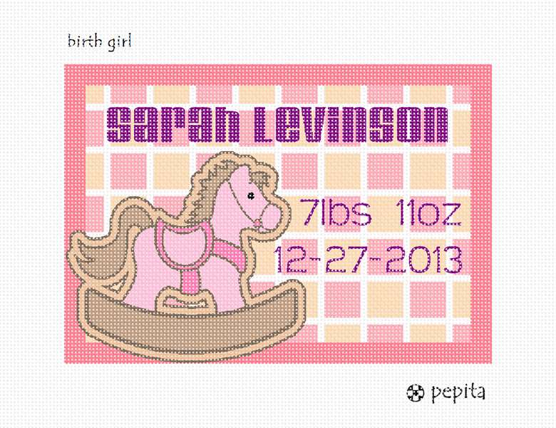 Birth announcement for a baby girl, featuring a pink wooden toy horsie against a boxy background.
