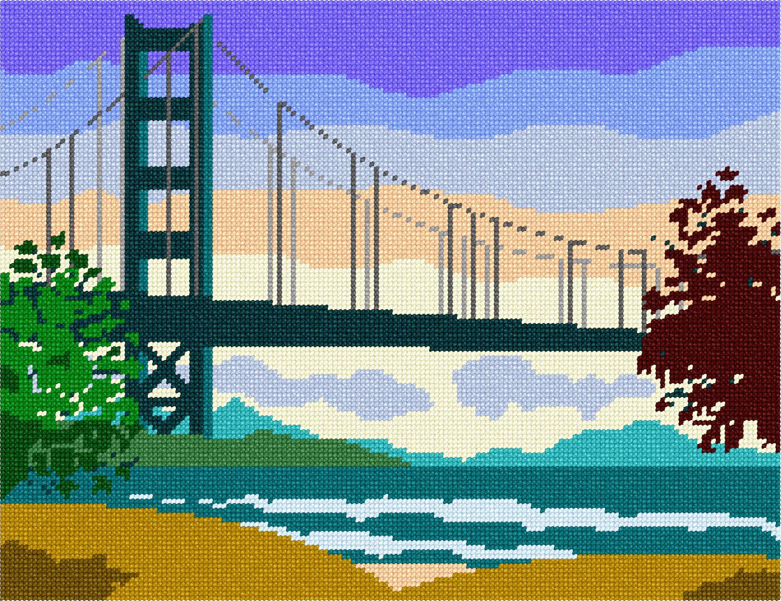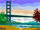Scenic painting-style design of a bridge in the distance, against the setting sun.