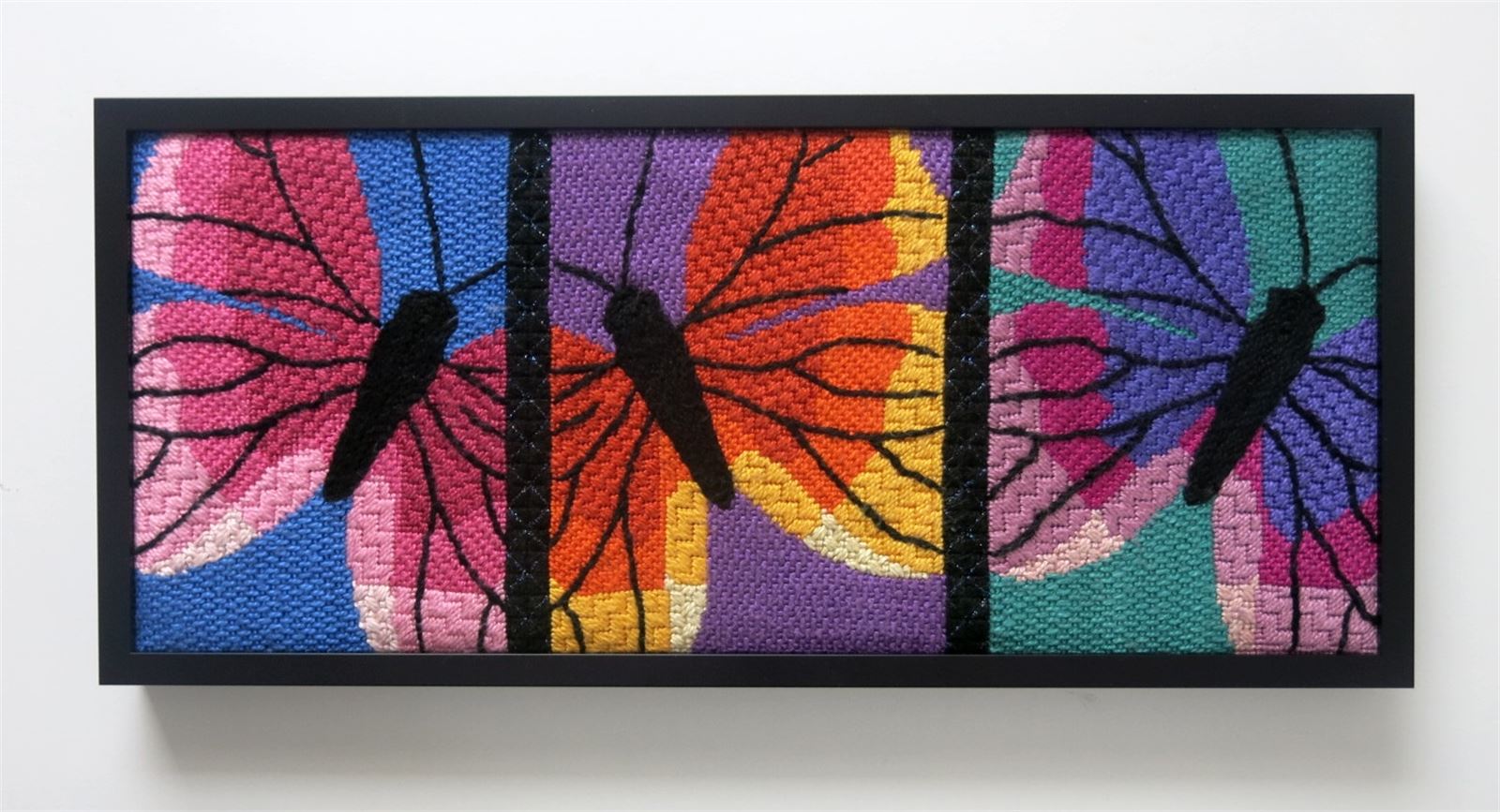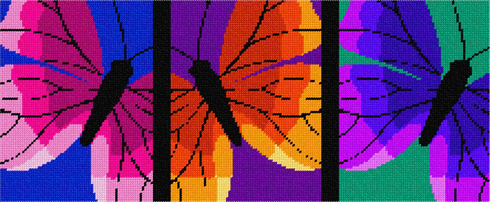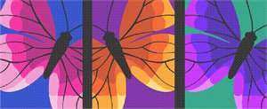 Vivid butterflies in bold shades of purples, oranges, and pinks. There are almost 20,000 butterfly species. Butterflies only live for a few weeks. Butterfly wings help them against predators. This collage design is available with two butterflies.