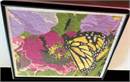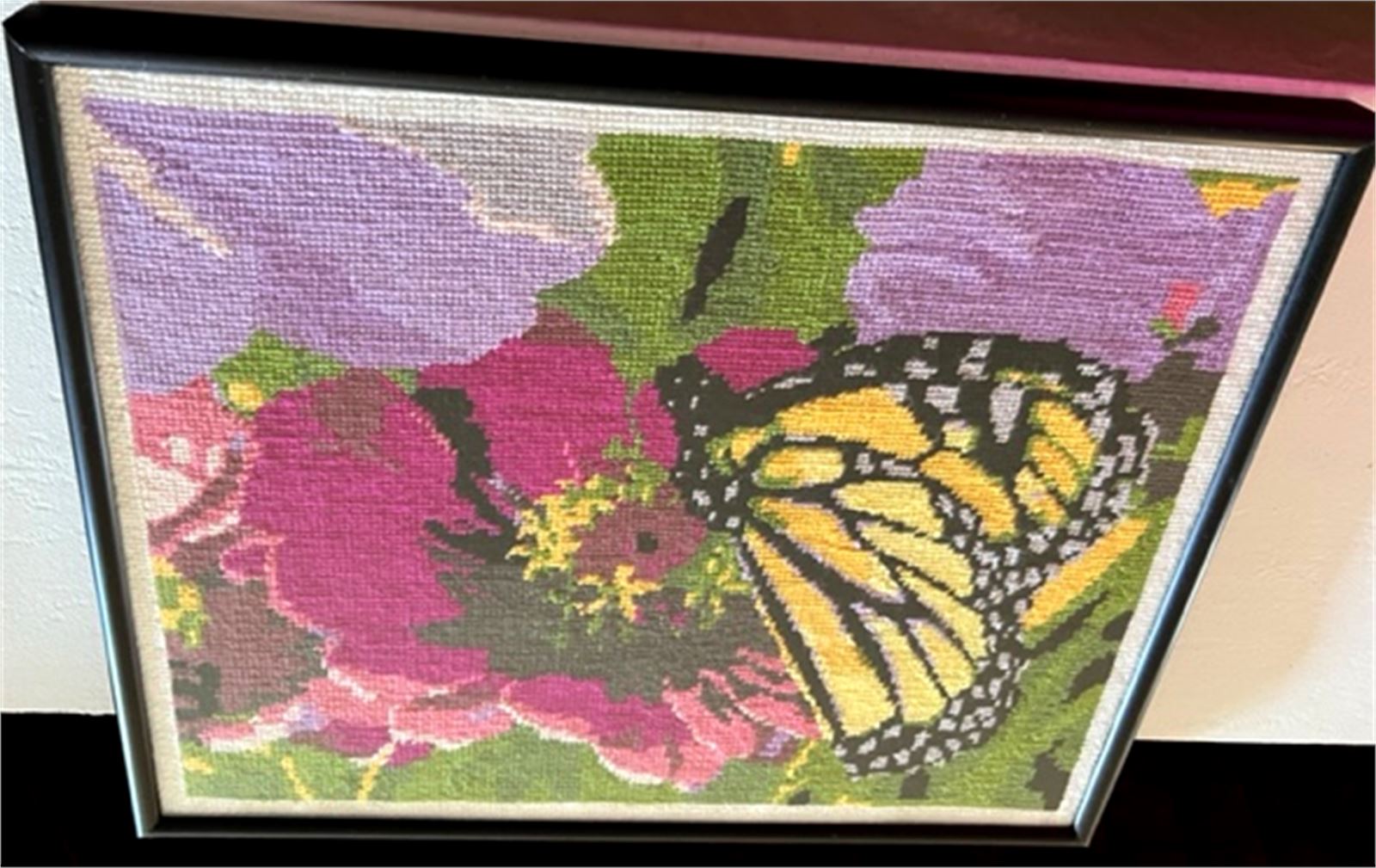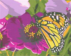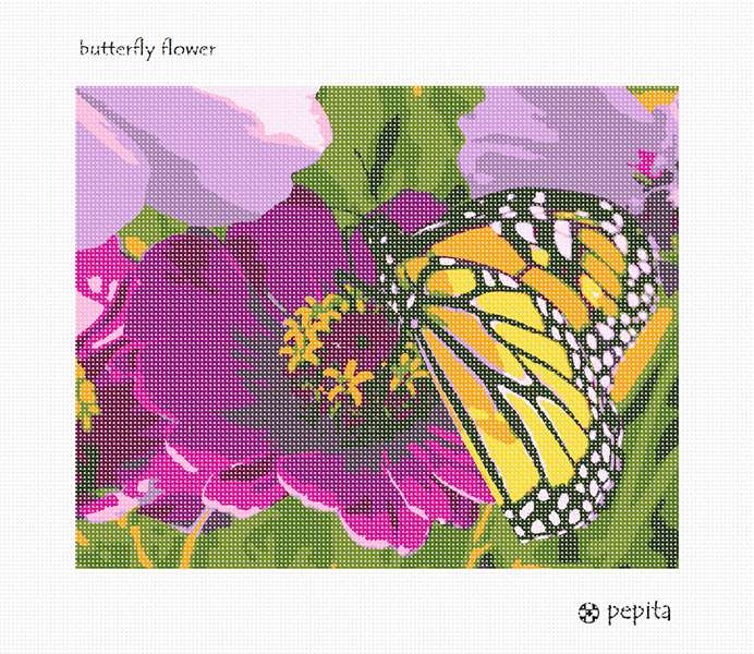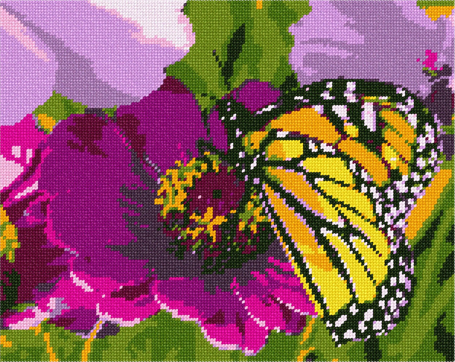 A yellow butterfly resting on a fuchsia flower. Butterflies are deep and powerful representations of life. Around the world, people view the butterfly as representing endurance, change, hope, and life. Flowers and floral design are among the most popular needlepoint designs. People have been stitching flowers and floral motifs for hundreds of years. Flowers are bright and pleasant, and most have underlying meanings to them.