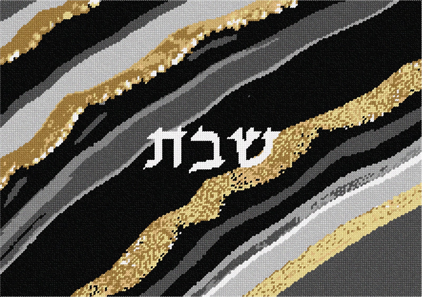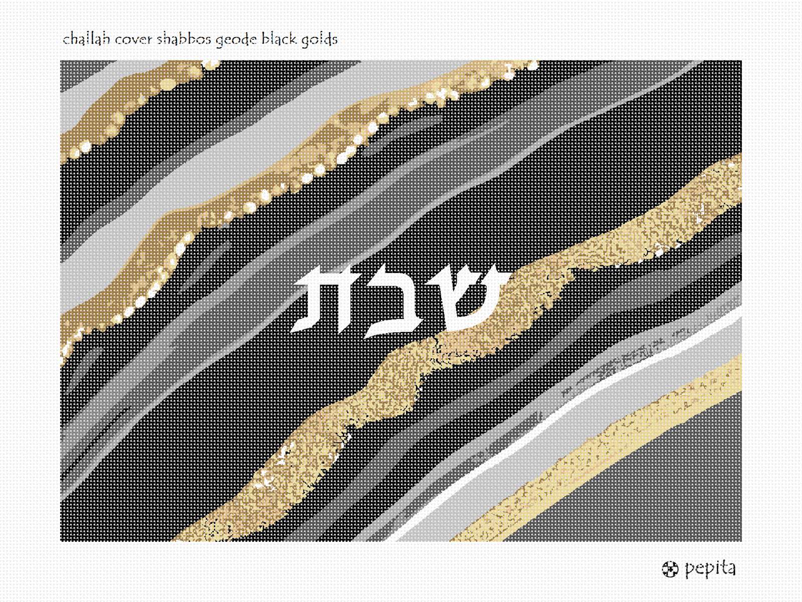A geode is a stone having a cavity lined with crystals or mineral matter. Most geodes contain clear quartz crystals. Geodes are found all over the world especially in desert regions. This summer I experimented with resin art to create geode looks on glass. That inspired me to design tefillin, tallit, and challah covers with geode characteristics. This challah cover needlepoint will enhance and Shabbat meal. I lvoe the classic black and white with the modern twist of gold leaf resin.