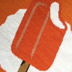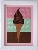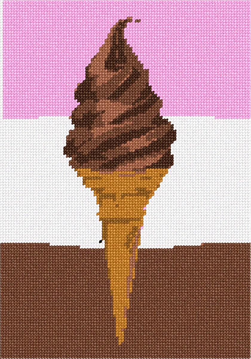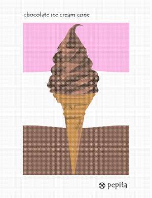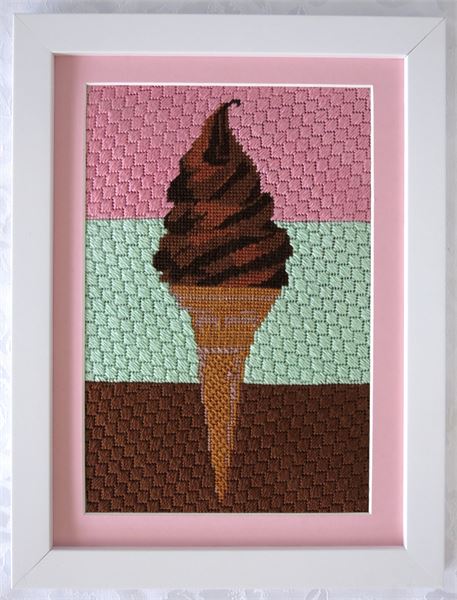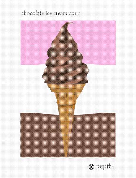 Chocolate ice cream on a cone with a vanilla chocolate strawberry background. Stitch this needlepoint; it is a calorie free chocoholic project. Many people think vanilla was the first ice cream flavor invented since it is the most popular, but that is actually not the case. In the 4th century B.C., the Roman emperor Nero had servants go into the mountains to collect snow that was used to make a frozen dessert flavored with honey, nuts, and fruit toppings