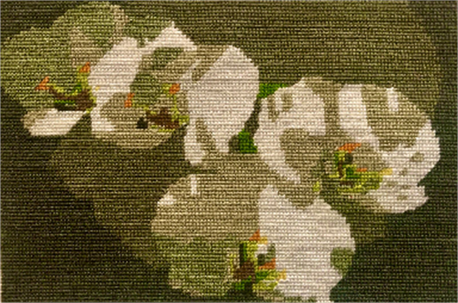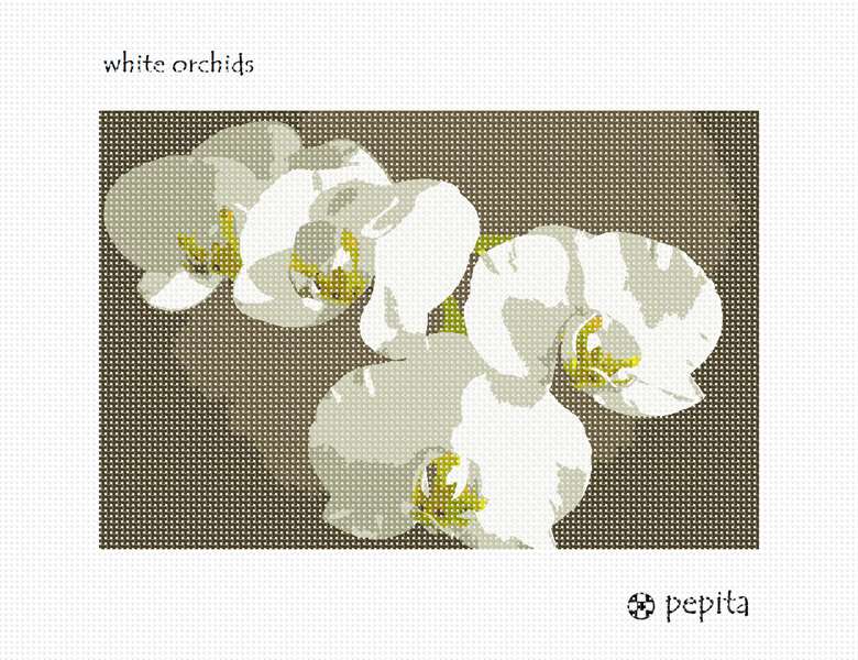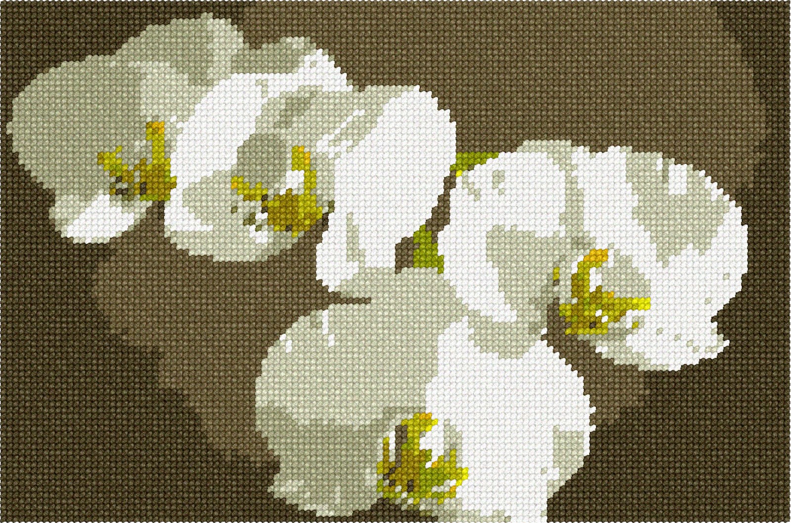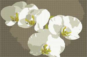 A fresh string of white orchids against a taupe background. Orchids are a most beautiful flower. They are available in many colors and variations. Interestingly enough, the best way to water an orchid is to place an ice cube on the soil. This way the water seeps in slowly. Flowers and floral design are among the most popular needlepoint designs. People have been stitching flowers and floral motifs for hundreds of years. Flowers are bright and pleasant, and most have underlying meanings to them.