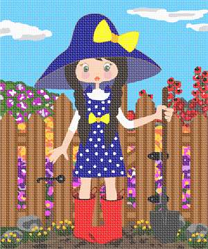 An adorable little girl is holding a gardening shovel in this lovely garden scene.See coordinating little girl picking flowers.