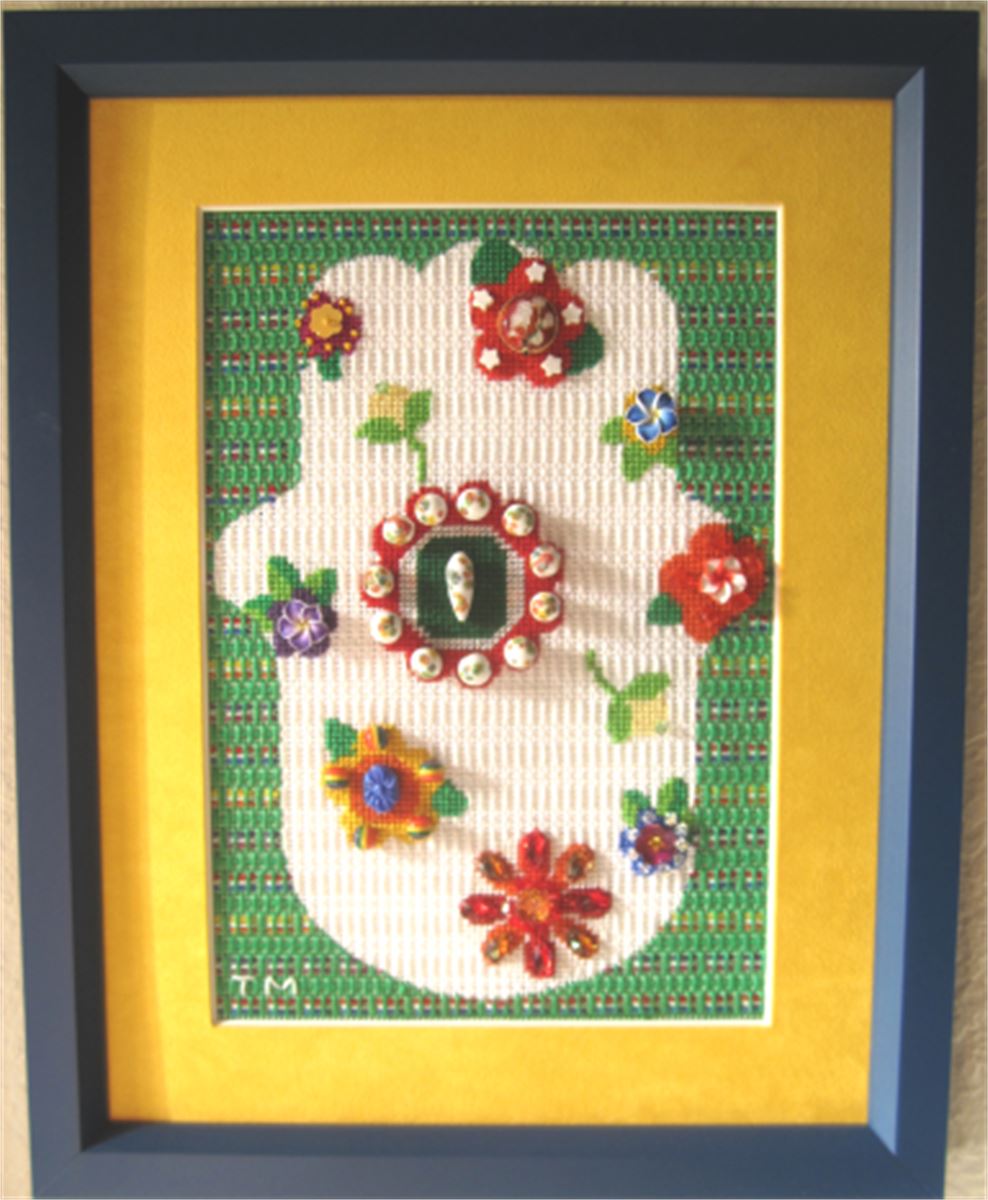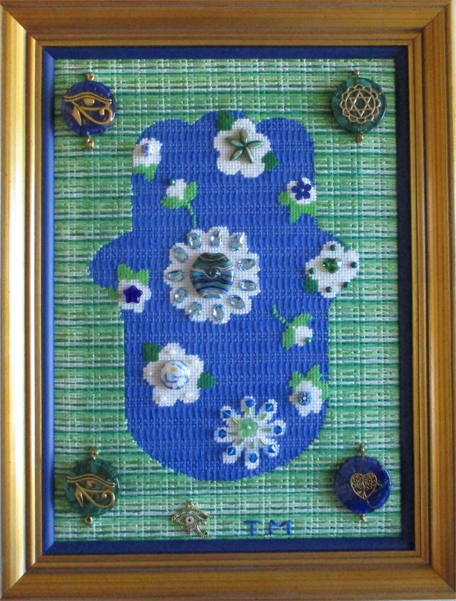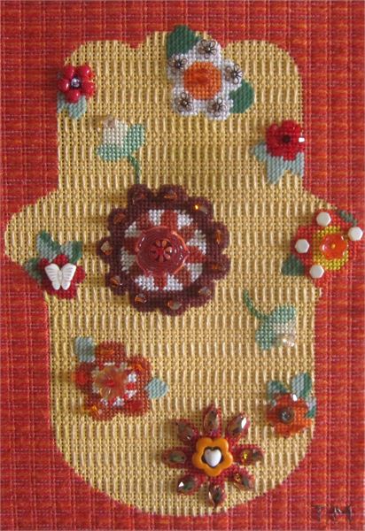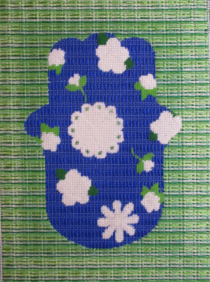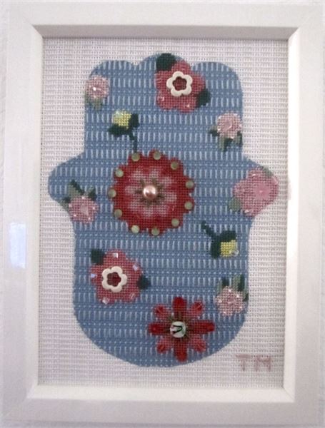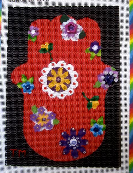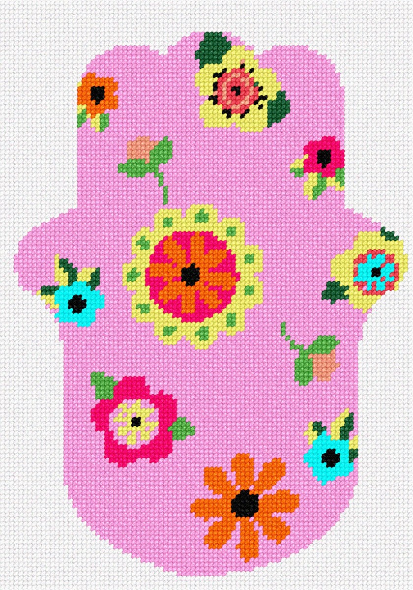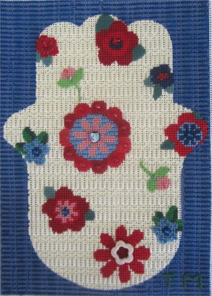 A Hamsa amulet hand to needlepoint. It is filled with art deco flowers. A hamsa is a palm-shaped amulet popular throughout the Middle East and North Africa and commonly used in jewelry and wall hangings. Flowers and floral design are among the most popular needlepoint designs. People have been stitching flowers and floral motifs for hundreds of years. Flowers are bright and pleasant, and most have underlying meanings to them.